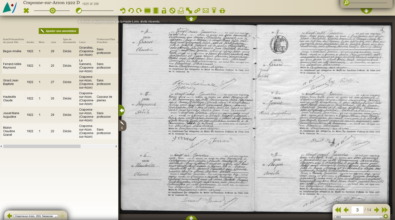 - Durant cette période de retrait forcé, nombreuses sont les bonnes volontés faisant preuve de soutien et de solidarité. La Culture n'est certes pas la priorité du moment pour ce type d'entraide, elle revient aux services de soins médicaux et à ceux qui les animent en se portant au secours de leurs semblables. Force est de constater qu'assujettis à domicile, l'écran est plus que jamais pour nombre d'entre nous une fenêtre ouverte sur le reste du monde et par la force des choses sur nos propres territoires, notre département, notre ville, notre quartier... C'est précisément à distance au travers d'écrans que s'engagent dans le domaine de l'action culturelle de remarquables collaborations. Les Archives départementales de la Haute-Loire ont ainsi la chance de recevoir le concours de collaborateurs des Archives départementales de la Loire qui se sont proposés pour contribuer à l'indexation des registres d'état civil de communes limitrophes des départements Loire/Haute-Loire (ancien Forez). Nous tenons à remercier vivement nos collègues de la Loire pour leur aide aussi inattendue qu'appréciée qui ravira les amateurs de généalogie de la Loire, de la Haute-Loire et d'ailleurs !