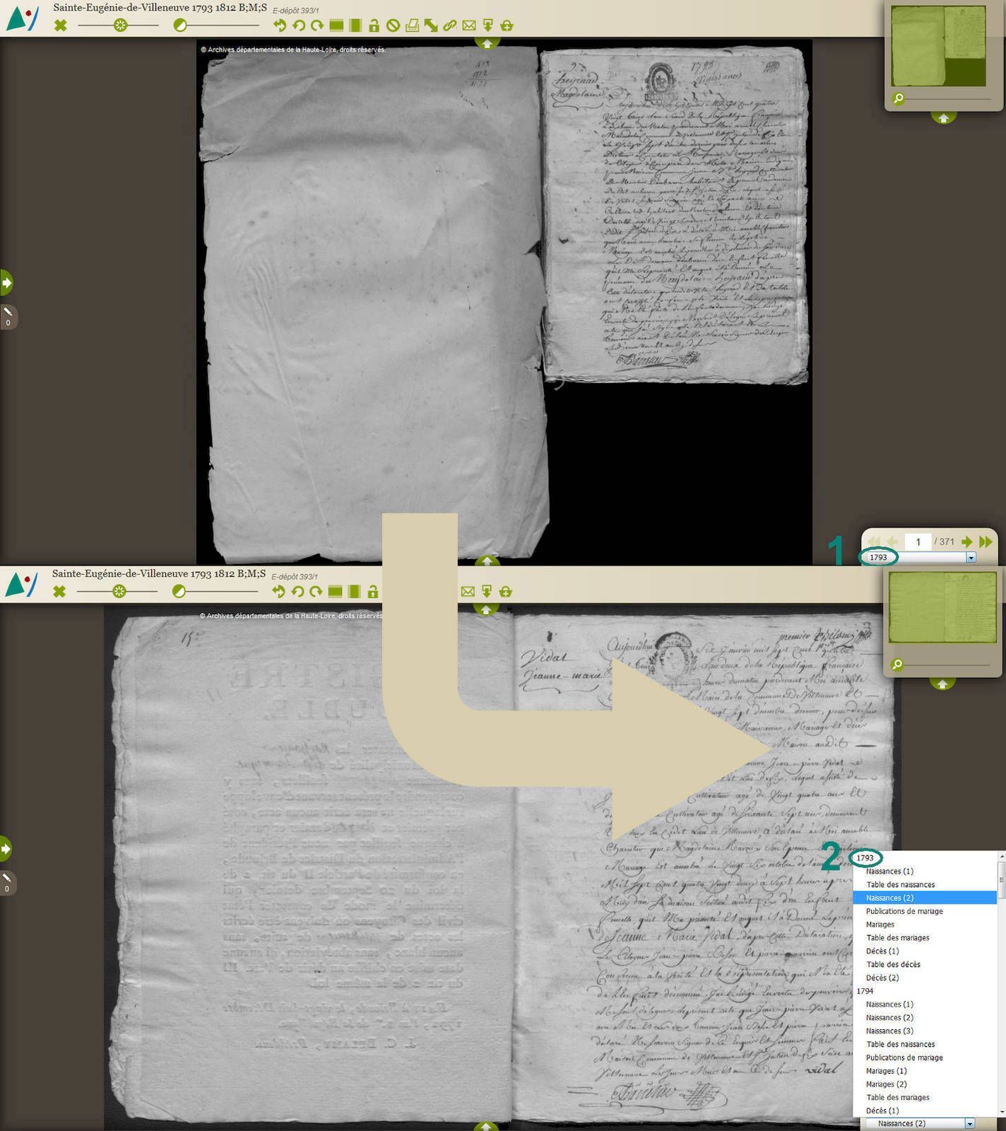- Il est important de préciser qu'en plus de la gestion des signets, Franck relève de nombreuses corrections à apporter concernant la description et le contenu des registres (dates extrêmes inexactes, lacunes non précisées, pages en double, etc.) ce qui nous permet d'améliorer la description détaillée des registres en ligne.