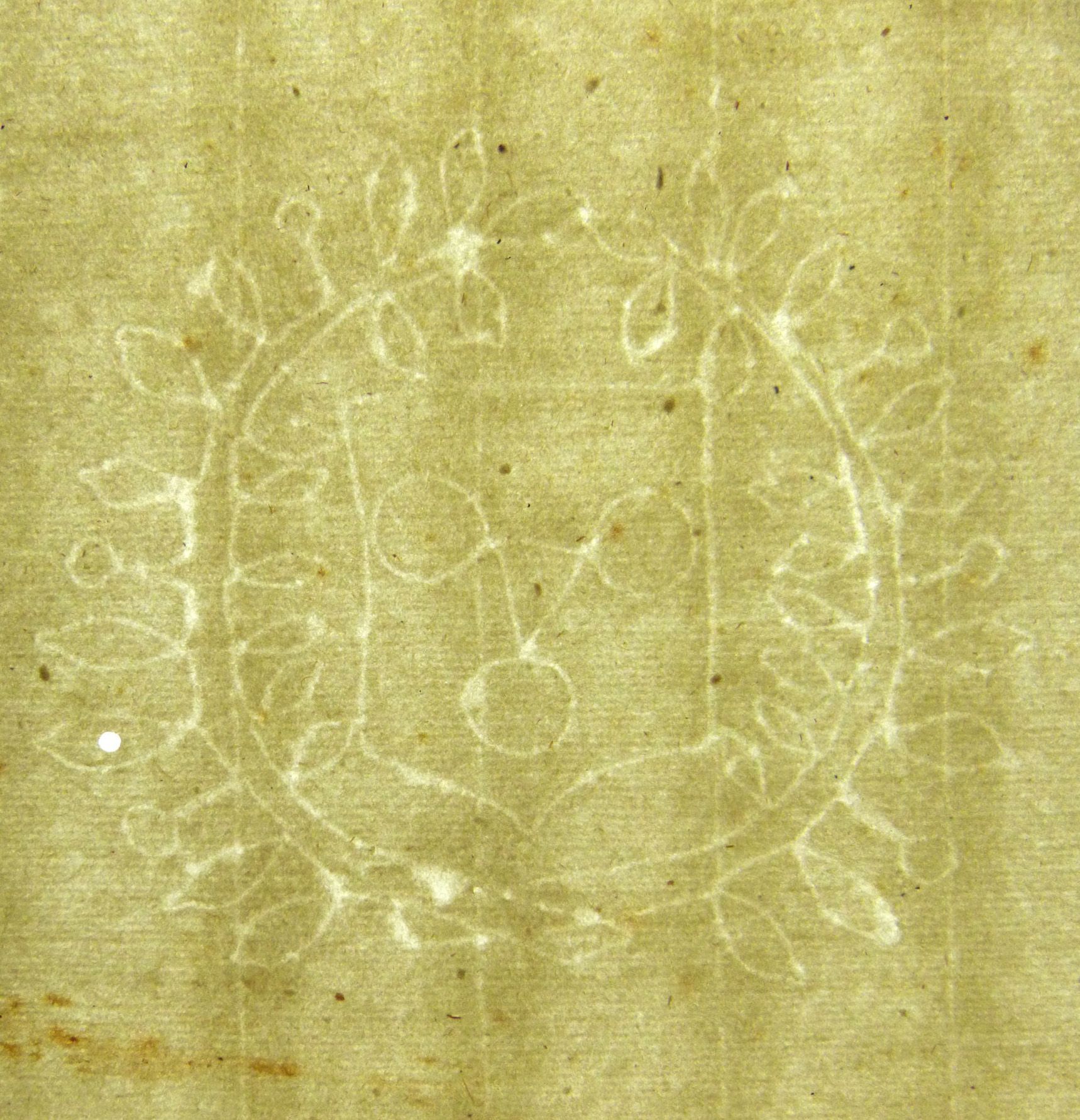 - Très beau registre à couverture cuir, il est constitué de feuilles de papier vergé dont on peut apercevoir le filigrane par transparence. D’après l’ouvrage de Pierre Delaunay, « Filigranes d’Auvergne, catalogue des filigranes relevés sur les papiers d’archives en Auvergne », il s’agit des armes de la famille de Boulogne qui possédaient des liens avec la Maison d’Auvergne. Il explique la reproduction de ce blason par le fait que le papetier ait voulu flatter ou rendre hommage à son seigneur. Le papetier reste à déterminer. Noter que les registres à reliure de cuir sont soigneusement nettoyés à la gomme, cirés puis lustrés.
