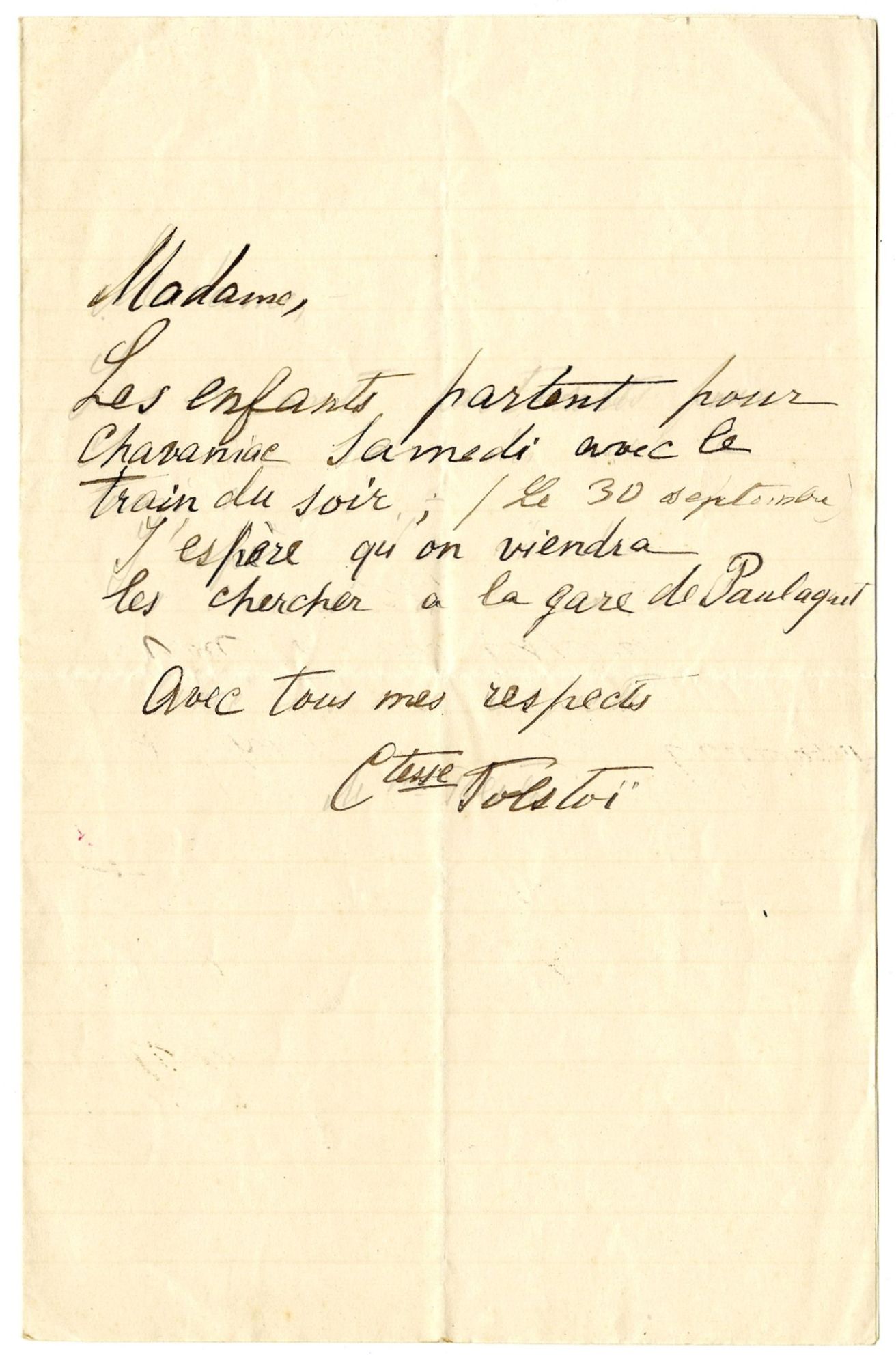- Dans cette lettre, la comtesse Tolstoï informe en toute simplicité le Mémorial Lafayette de l’arrivée imminente des deux petits-fils du célèbre écrivain Léon Tolstoï au Préventorium de Chavaniac. Comme de nombreux « Russes blancs » émigrés depuis la Révolution de 1917, les deux frères Tolstoï, ainsi que plusieurs membres de leur famille, ont fui la Russie et ont trouvé refuge en France. Plusieurs enfants russes sont ainsi envoyés à Chavaniac où ils ont l’opportunité d’être bien pris en charge.
