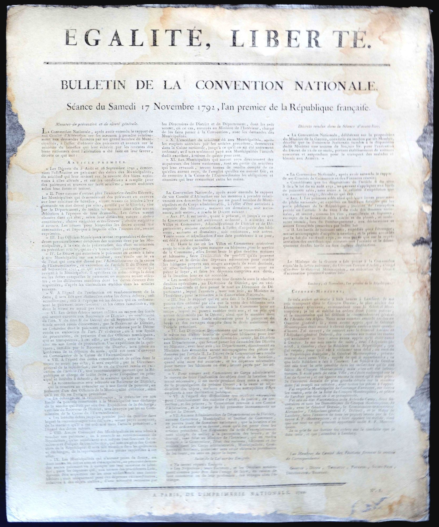 - Le Bulletin de la Convention nationale est l’organe officiel du gouvernement révolutionnaire qui s’est mis en place en France entre le 22 septembre 1792 et le 26 octobre 1795. Imprimé par l’Imprimerie nationale, ce journal diffusait quotidiennement une ou plusieurs pages des débats parlementaires de son assemblée. L’arrivée de cet ensemble aux Archives de la Haute-Loire est ancienne et indéterminée. Il est composé de 184 feuillets couvrant la période 29 octobre 1792-29 vendémiaire an III (30 octobre 1794) dans un état de conservation dégradé. La plupart des pages ont subi des altérations d’une part liées à l’eau entrainant fragilisation du papier, déchirures et lacunes plus ou moins importantes et d’autre part aux multiples manipulations de consultation.