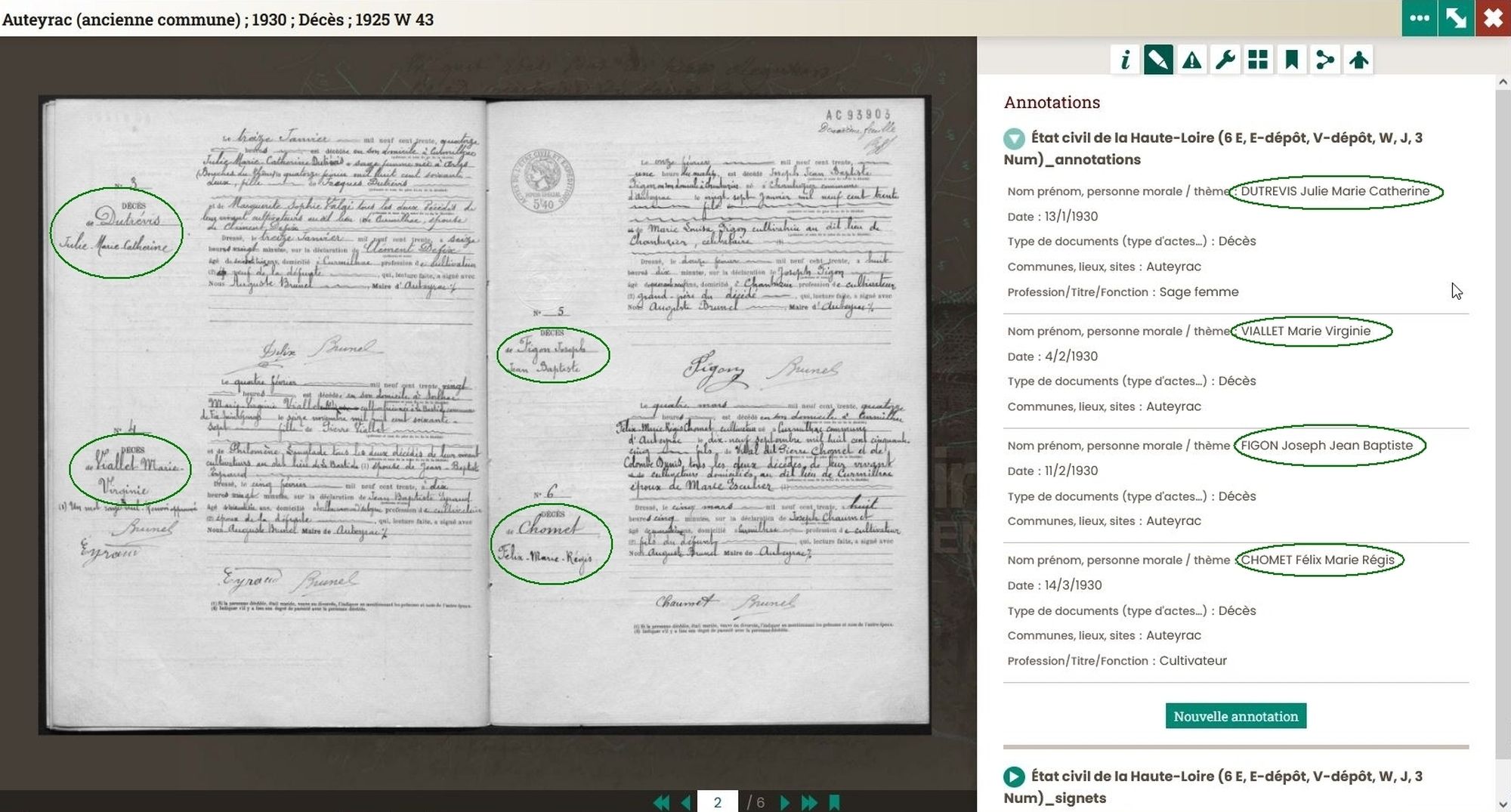 - La période retenue à l'origine de ce projet correspondait principalement aux années 1913-1930 car ces actes assez récents sont aisés à lire, en comparaison de ceux des siècles antérieurs. La typologie ne concernait que les actes de mariage et de décès puisque les délais autorisés par la CNIL pour leur indexation en ligne sont plus courts que ceux des actes de naissance. Quant à la zone géographique, chacun a pu opter pour la région de son choix mais ce sont principalement des communes des arrondissements du Puy-en-Velay et de Brioude qui sont concernées, les collègues des Archives départementales de la Loire ayant en toute logique travaillé sur l'arrondissement d'Yssingeaux qui jouxte le département de la Loire.
