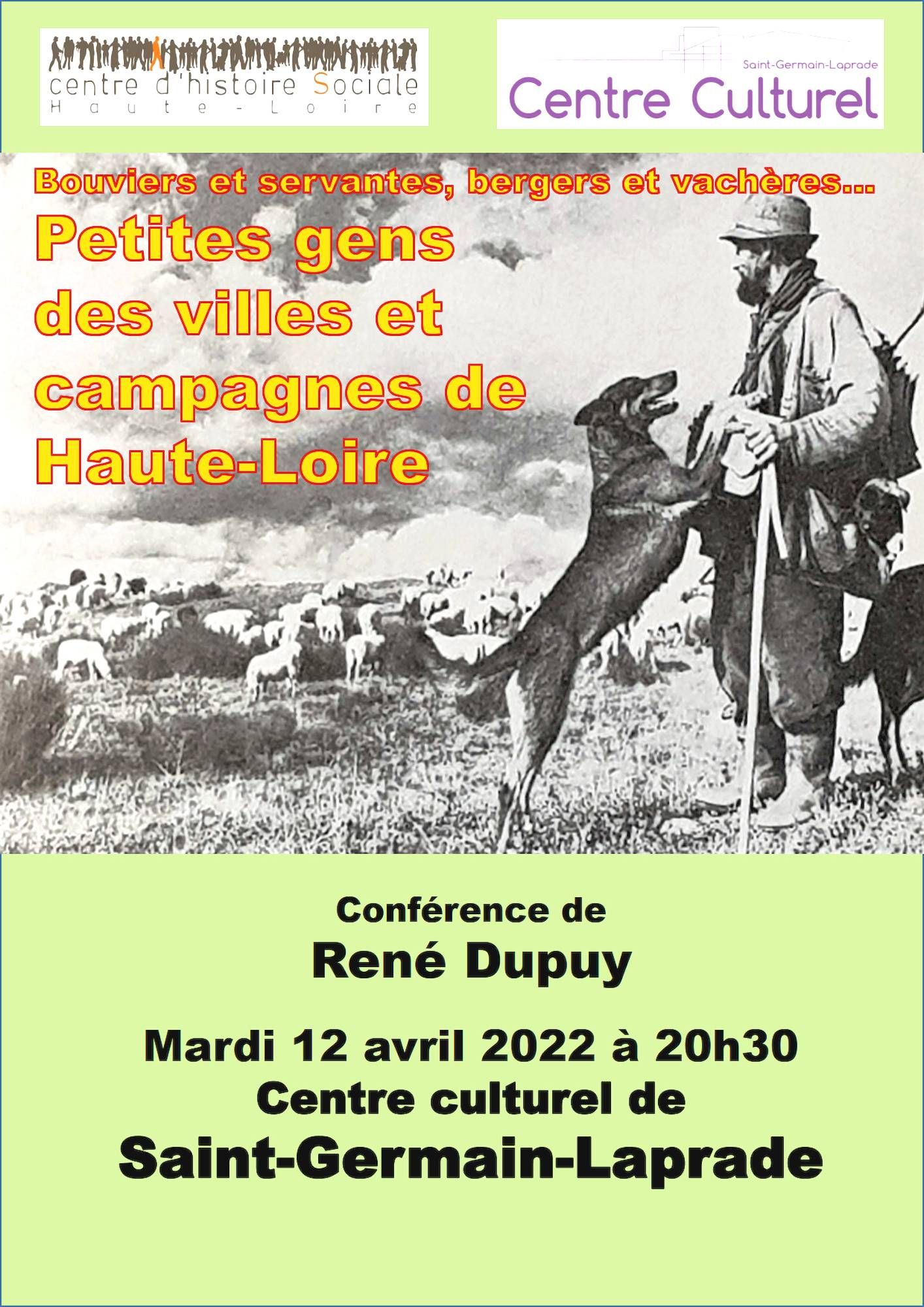- La prochaine conférence du Centre d'Histoire Sociale de la Haute-Loire de la Haute-Loire, Domestiques et servantes, bergers et vachères... Petites gens des villes et campagnes de Haute-Loire, animée par René Dupuy, aura lieu mardi 12 avril à 20h30 au Centre Culturel de Saint-Germain-Laprade. L'entrée est gratuite.