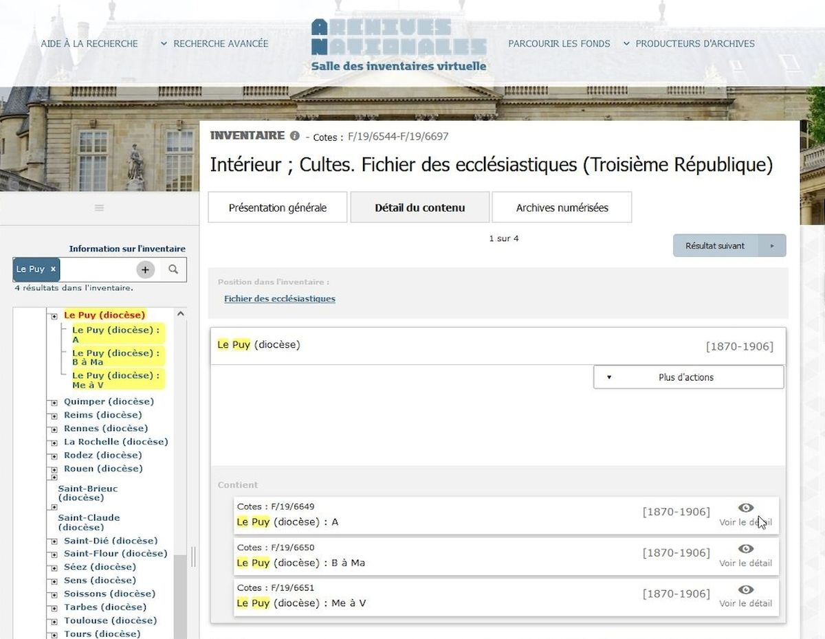 - Concernant le diocèse du Puy, les fiches nominatives classées dans l'ordre alphabétique sont réparties dans trois boîtes cotées F/19/6649 à 6651, et couvrent la période 1870-1906.