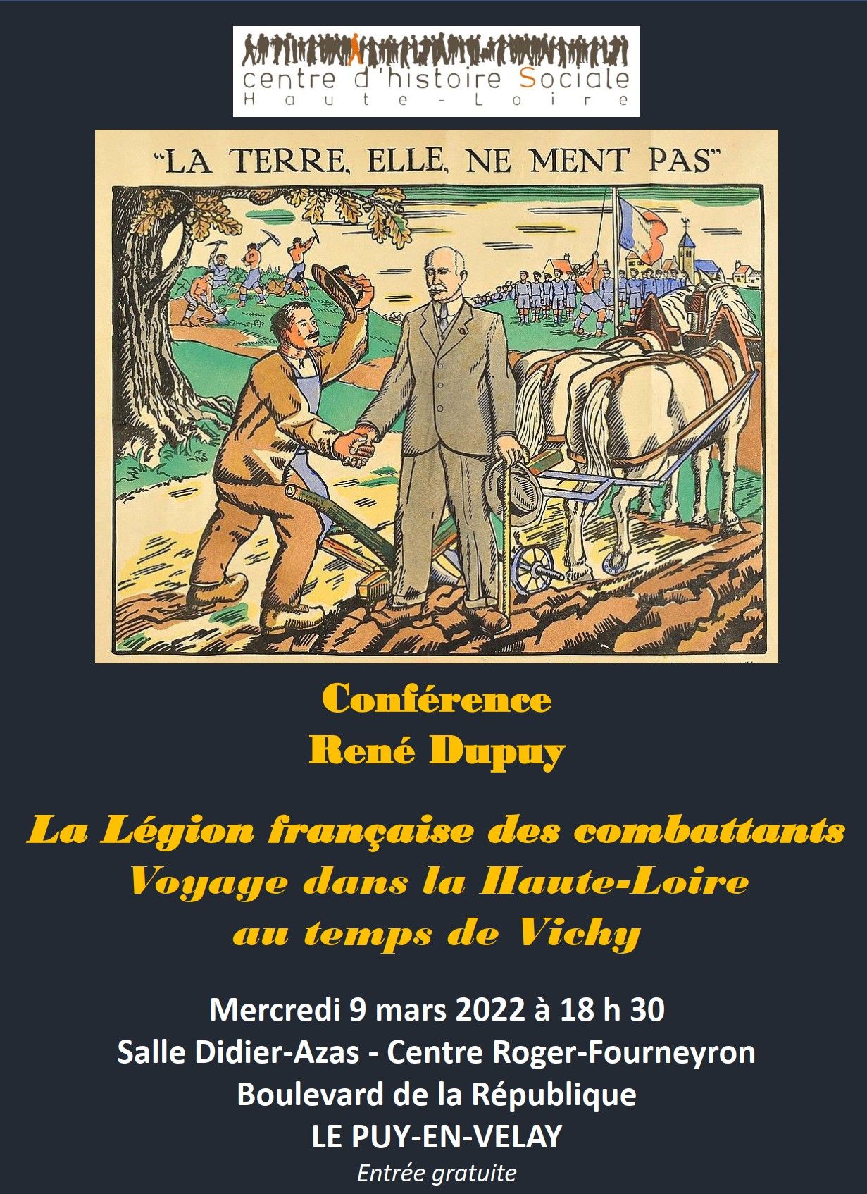 - La prochaine conférence organisée par le Centre d'Histoire Sociale Haute-Loire , intitulée "La Légion Française des Combattants. Voyage dans la Haute-Loire au temps de Vichy", sera présentée par René Dupuy, mercredi 9 mars 2022, à 18h30 à la salle Didier-Azas du Centre Roger-Fourneyron au Puy-en-Velay (entrée gratuite). L’auteur propose d’évoquer la réalité de cette organisation, mise en place le 29 août 1940 par le par le régime de Vichy, vécue par habitants du département. La première mention de la Légion Française des Combattants, qui a compté plus de quinze mille adhérents en Haute-Loire selon l’auteur, trouvée dans la presse ancienne conservée aux Archives départementales, paraît dans un entrefilet du journal La Liberté du Dimanche du 8 septembre 1940 (2 PB 6).