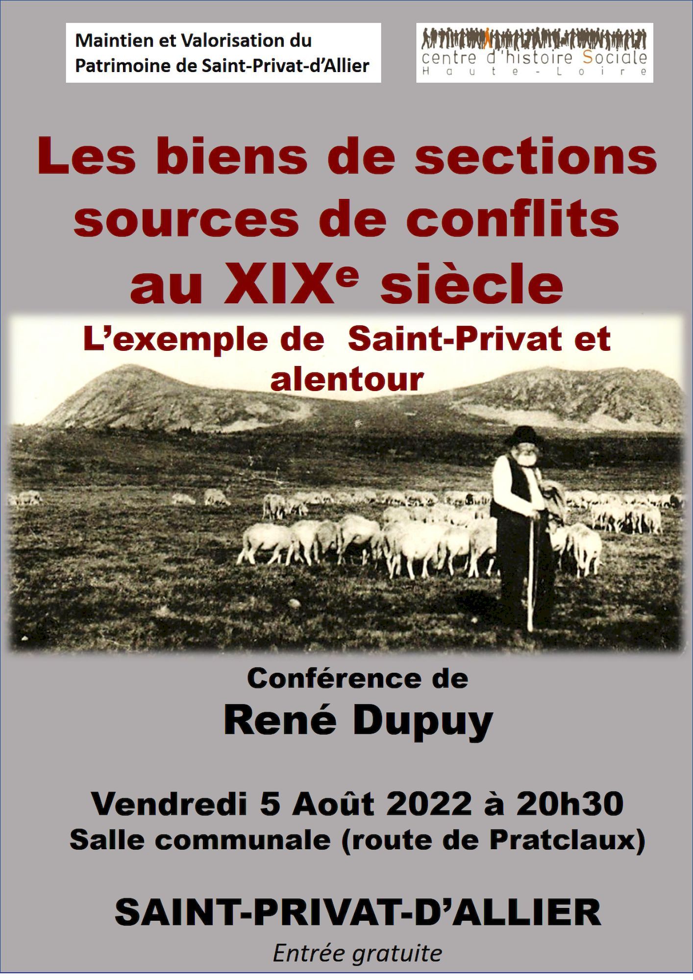 - En collaboration avec le Centre d'histoire sociale de la Haute-Loire, l'association Maintien et Valorisation du Patrimoine de Saint-Privat-d'Allier organise une conférence de René Dupuy "Les biens sectionaux sources de conflits au XIXe siècle. L'exemple de Saint-Privat-d'Allier et alentour",