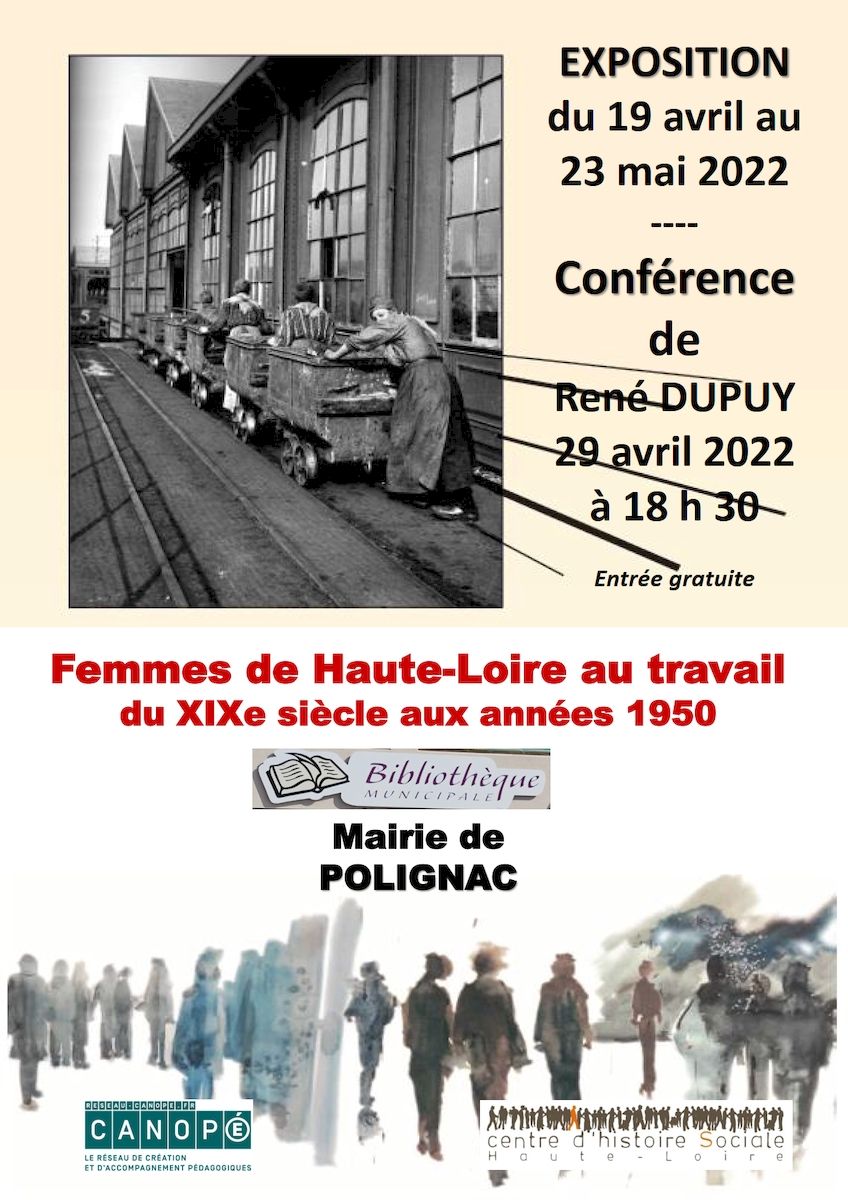 - Le Centre d'histoire sociale de la Haute-Loire propose une causerie autour de l'exposition Les femmes de Haute-Loire au travail, animée par René Dupuy, vendredi 29 avril 2022 à 18h30, à la mairie de Polignac. L’exposition, conçue par les historiens du Centre d’histoire sociale, présente des situations de travail rémunéré des femmes de Haute-Loire du XIXe siècle aux années 1950. Neuf thèmes sont abordés :