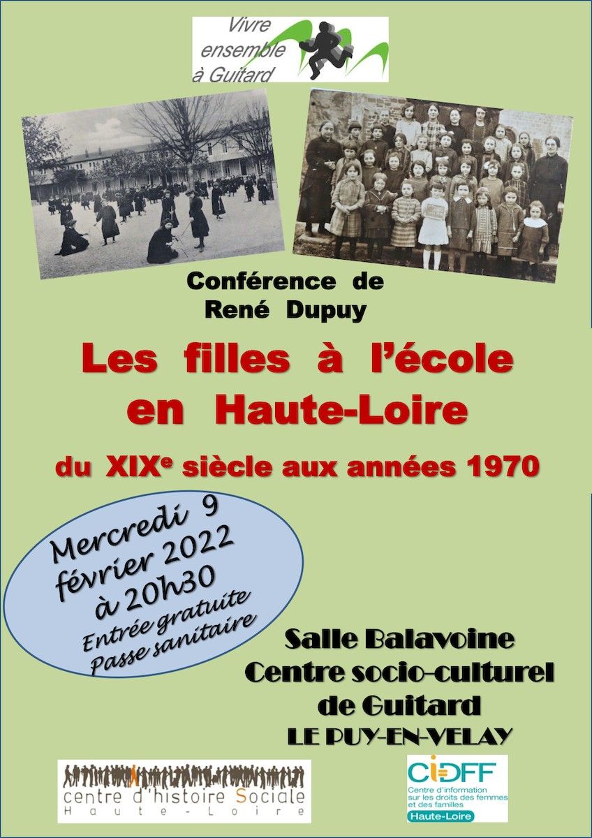 - L'association Vivre ensembles à Guitard (dont la mission est d'animer le quartier en collaboration avec les autres associations locales et les habitants), le Centre d’information sur les droits des femmes et des familles (CIDFF 43) et le Centre d'histoire sociale de la Haute-Loire , organisent une conférence animée par René Dupuy intitulé Les filles à l'école en Haute-Loire du XIXe siècle à 1970, mercredi 9 février 2022 à 20h30 à la salle Balavoine du Centre socio-culturel de Guitard au Puy-en-Velay.