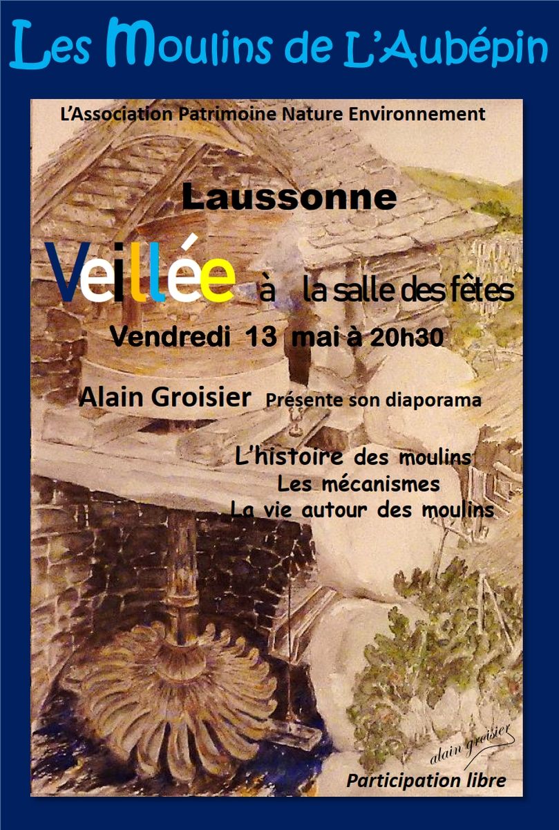 - L’association Patrimoine Nature Environnement de Laussonne propose une veillée intitulée L’histoire des moulins, les mécanismes, la vie autour des moulins, vendredi 13 mai 2022 à 20h30 à la salle des fêtes de Laussonne, animée par Alain Groisier, au cours de laquelle l’auteur présentera un diaporama sur les moulins de l’Aubépin à Laussonne.