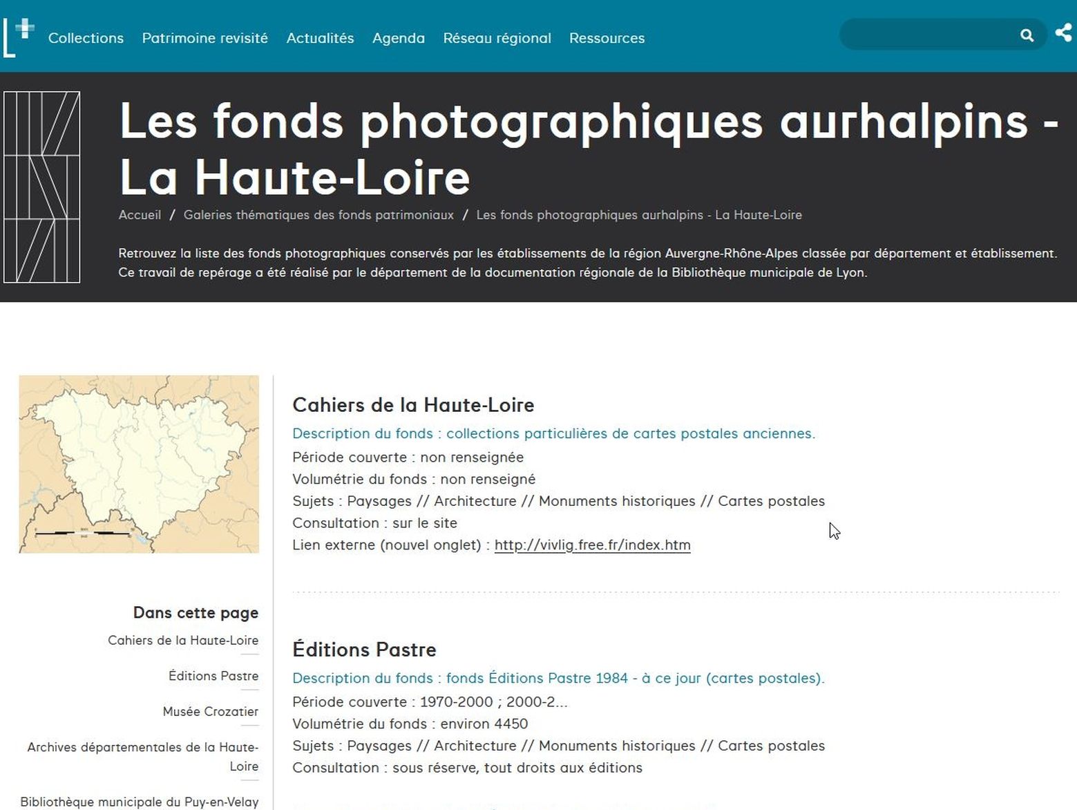 - Suite à un imposant travail de recensement effectué par David Cizeron (service de la Documentation régionale de la Bibliothèque municipale de Lyon, BmL) et mis en ligne par Emmanuelle Royon (Auvergne-Rhône-Alpes Livre et Lecture, ARALD), les fonds patrimoniaux aurhalpins, et donc ceux de Haute-Loire, sont énumérés sur le Portail du patrimoine écrit et graphique en Auvergne-Rhône-Alpes, lectura+. Environ 500 fonds pour plus de 170 structures sont ainsi répertoriés.