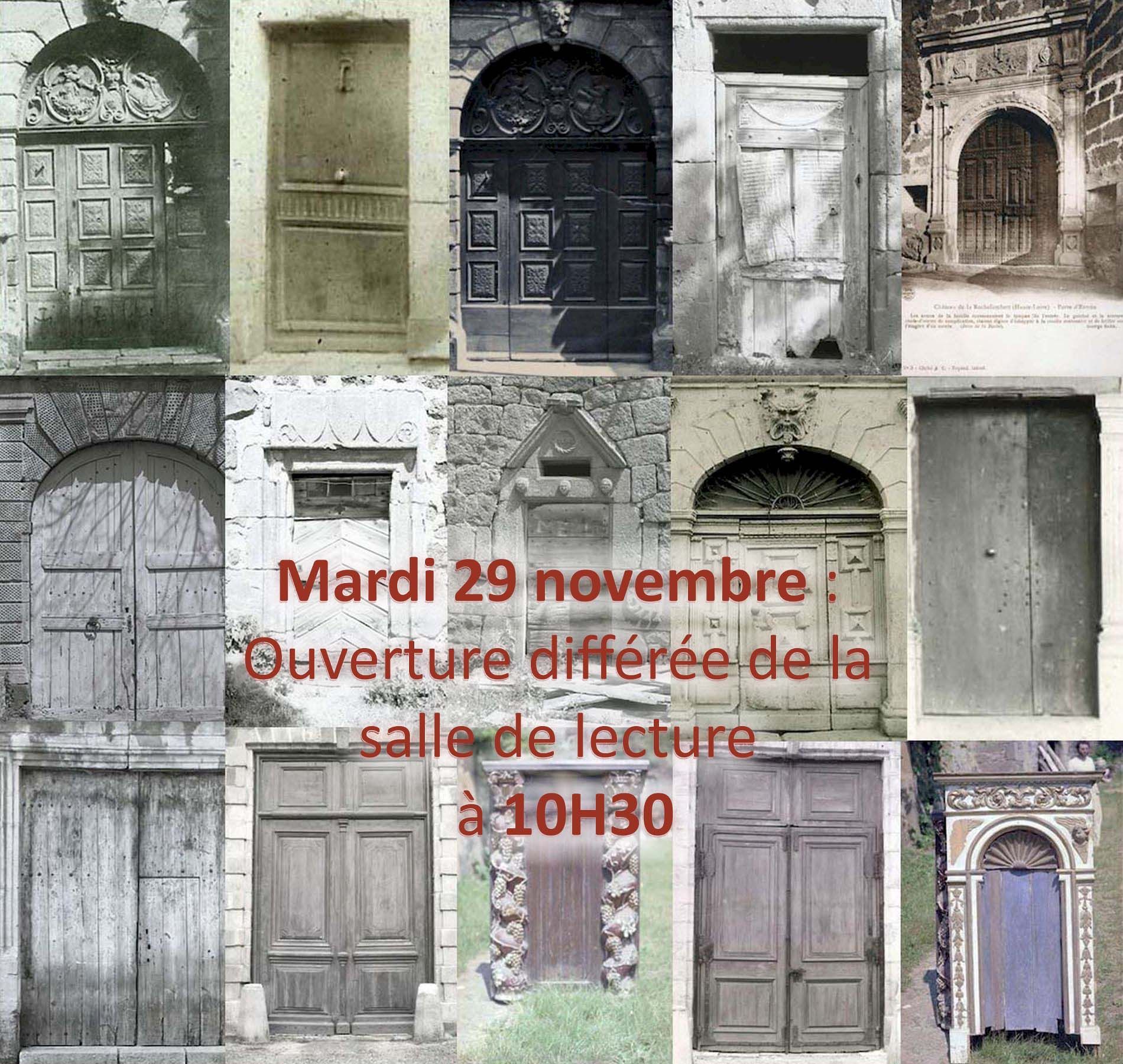 - Nous vous informons que les Archives départementales de la Haute-Loire ouvriront exceptionnellement au public à partir de 10h30 le mardi 29 novembre 2022, en raison d'une réunion de service.