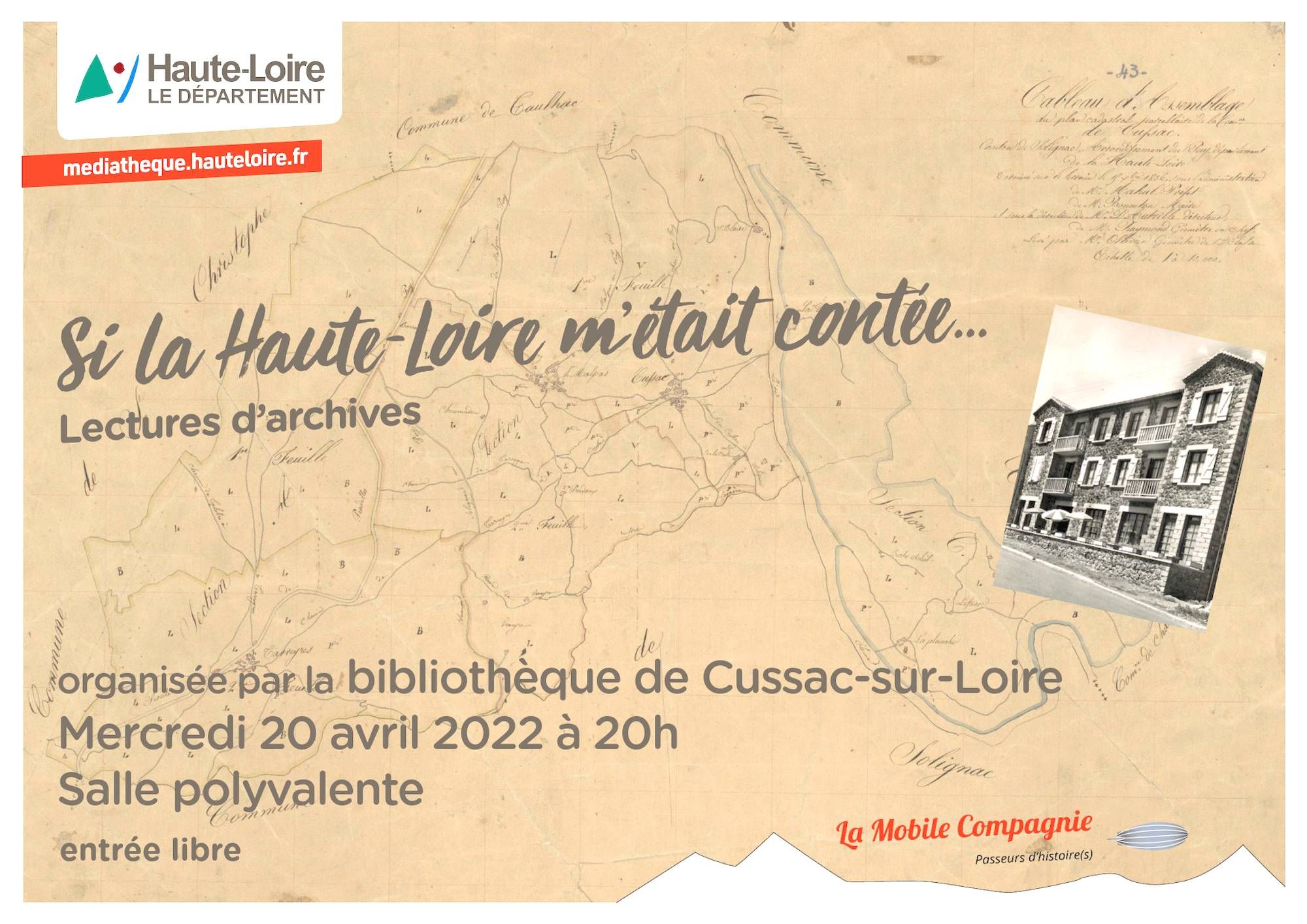 La Médiathèque départementale de la Haute-Loire organise en collaboration avec La Mobile Compagnie, mercredi 20 avril à 20h à la salle polyvalente de Malpas (hameau de la commune de Cussac-sur-Loire), une séance du spectacle Si la Haute-Loire m'était contée...