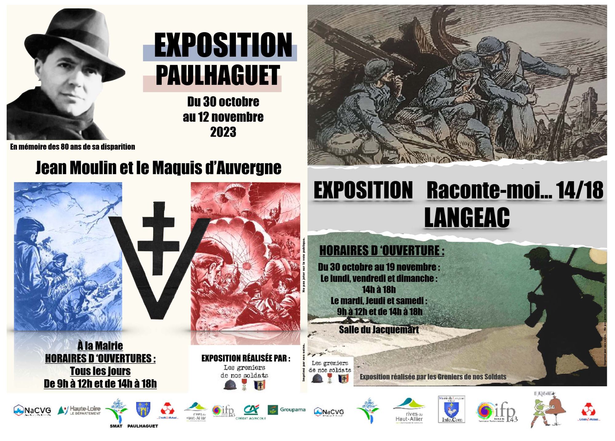 - L’association Les Greniers de nos Soldats organise du 30 octobre au 12 novembre deux expositions concomitantes à Langeac et à Paulhaguet, respectivement intitulées Raconte-moi... 14/18 Langeac et Jean Moulin et le maquis d'Auvergne. Pour ces deux occasions, le Pays d’Art et d’Histoire proposera des visites commentées des monuments aux morts et des expositions.