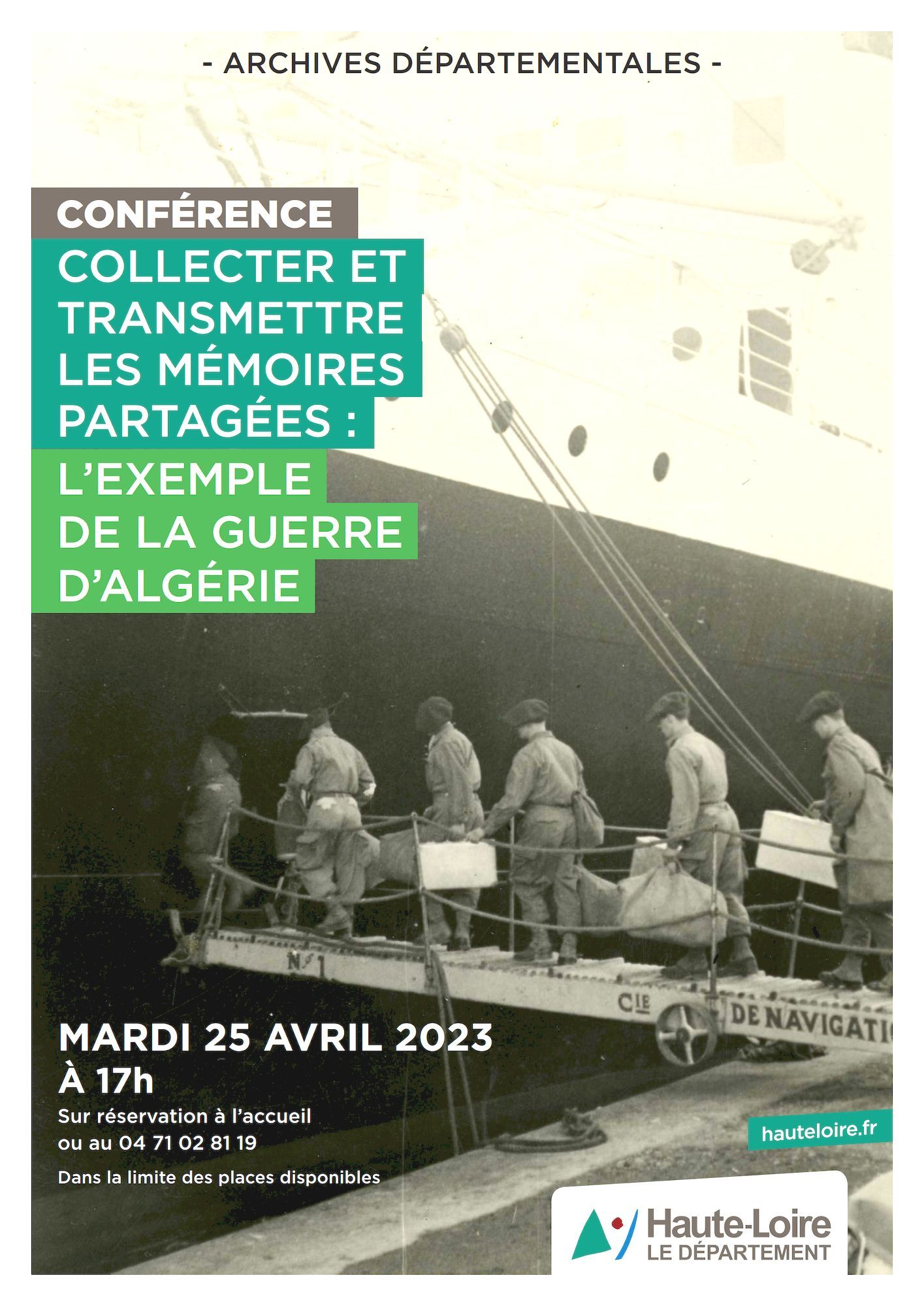 - Afin de marquer la fin de présentation de l'exposition "La guerre d'Algérie. Histoire commune, mémoires partagées ?" (visible jusqu'au 28 avril 2023), les Archives départementales organisent une conférence sur les enjeux de la collecte d'archives orales et de leurs diffusions, le mardi 25 avril, à 17h.