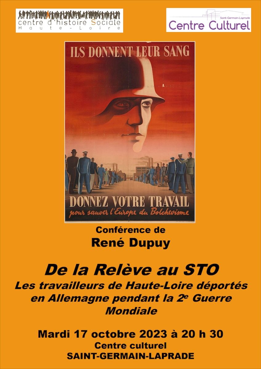 - Mardi 17 octobre 2023 à 20 h 30 au Centre culturel de Saint-Germain-Laprade, René Dupuy animera de nouveau la conférence intitulée "De la relève au STO, les travailleurs de Haute-Loire déportés en Allemagne pendant la Deuxième Guerre mondiale"