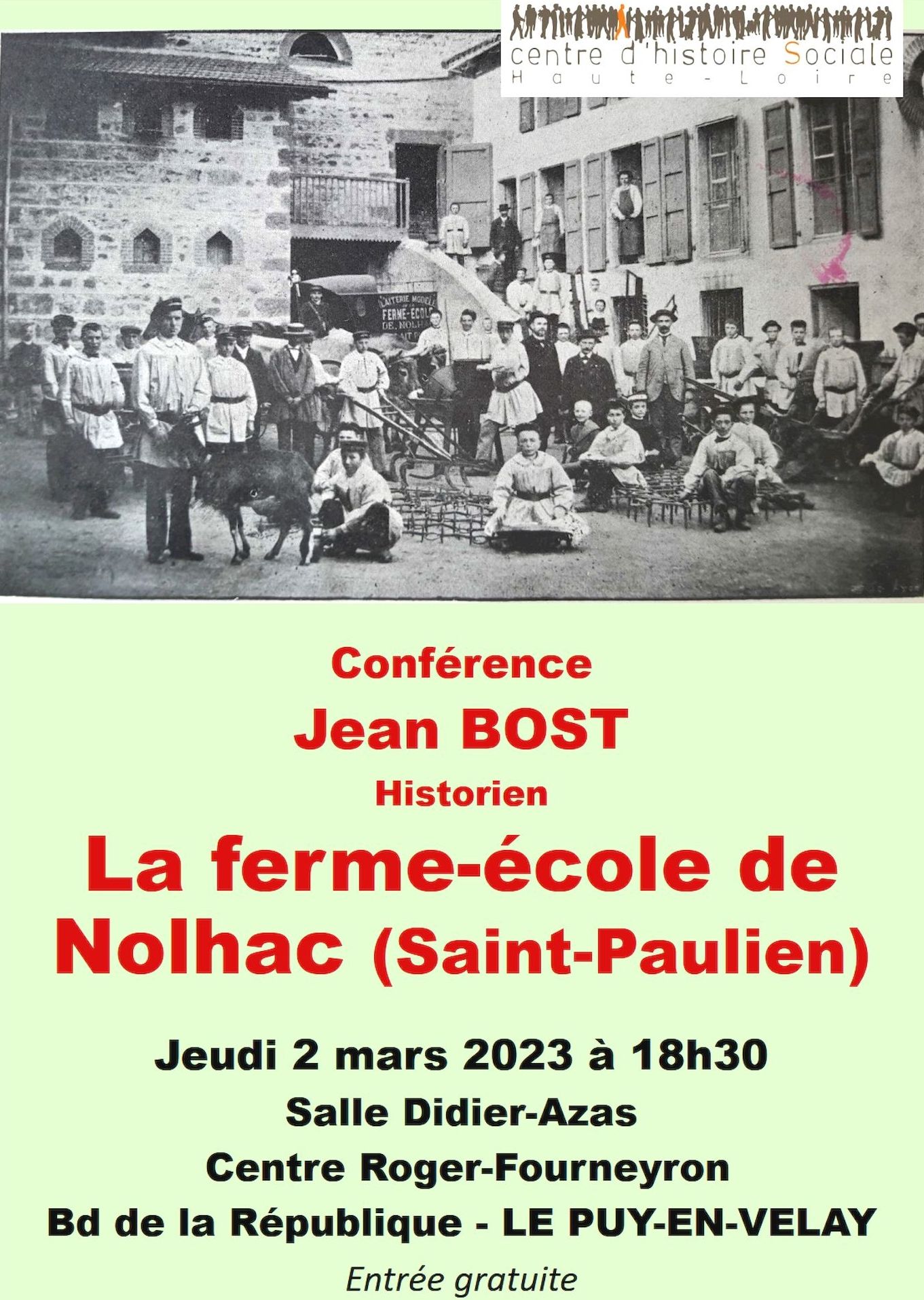 - Le Centre d'Histoire Sociale Haute-Loire vous convie à une conférence présentée par Jean Bost, historien, intitulée "La ferme-école de Nolhac (Saint-Paulien)", jeudi 2 mars 2023 à 18h30 au Centre Roger-Fourneyron au Puy-en-Velay (salle Didier-Azas).