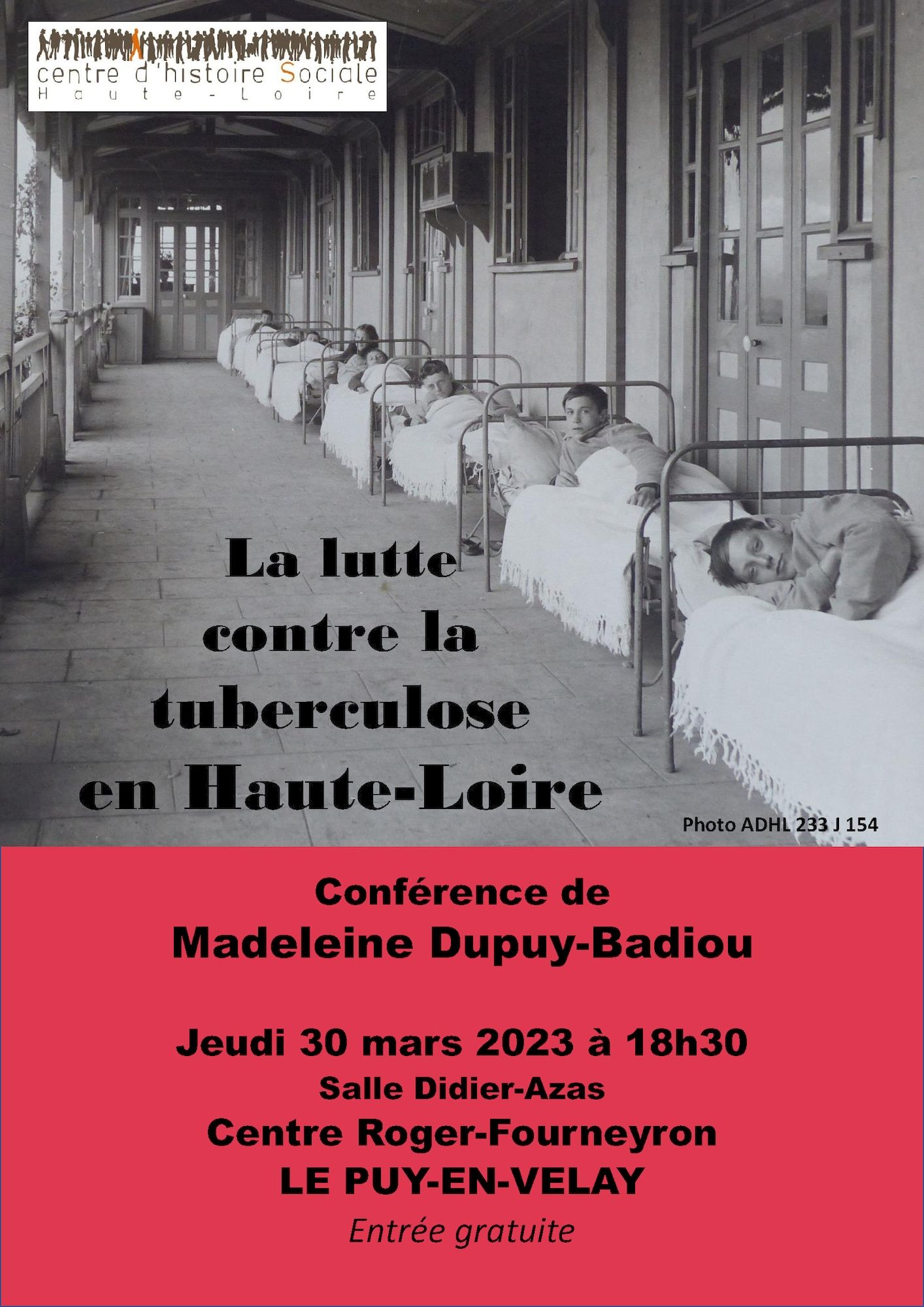 - La prochaine conférence du Centre d'Histoire Sociale Haute-Loire, animée par Madeleine Dupuy-Badiou, a pour thème et titre La lutte contre la tuberculose en Haute-Loire. Rendez-vous jeudi 30 mars 2023 à 18h30 à la salle Didier Azas au Centre Roger Fourneyron du Puy-en-Velay.