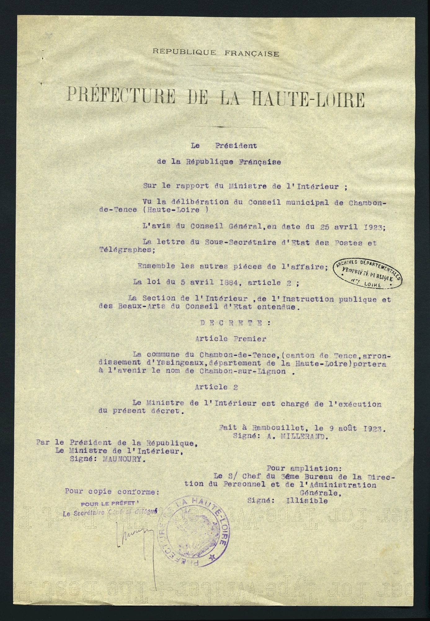 - C'est par un décret du 9 août 1923, il y a tout juste 100 ans, que notre #communedujeudi a pris le nom du Chambon-sur-Lignon. Auparavant, la commune portait le nom du Chambon-de-Tence mais cela entrainait de nombreuses confusions avec la commune voisine de Tence. Et dire qu'en 1893, c'était déjà les erreurs d'orientation qui avaient poussé la municipalité et l’administration des postes et télégraphes à demander de relever le nom de la commune pour éviter toute confusion avec d'autres Chambon de la région...