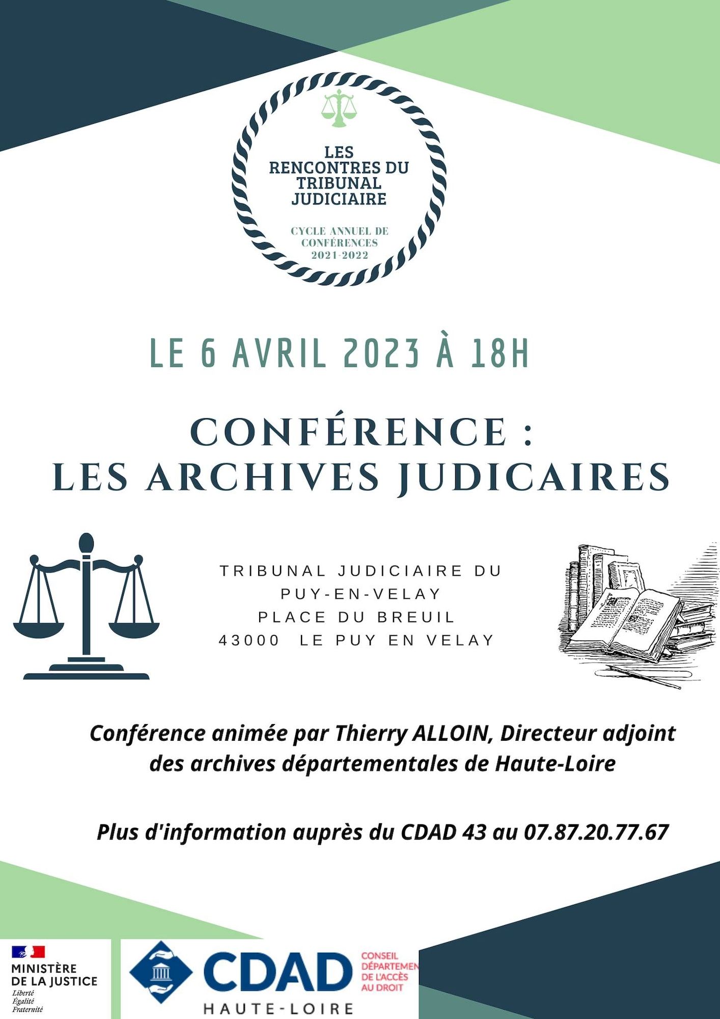 - Le Tribunal judiciaire du Puy-en-Velay accueillera une nouvelle conférence animée par Thierry Alloin, directeur adjoint des Archives départementales de Haute-Loire, jeudi 6 avril 2023 à 18h, dans le cadre du cycle annuel de conférences "Les Rencontres du tribunal judiciaire".