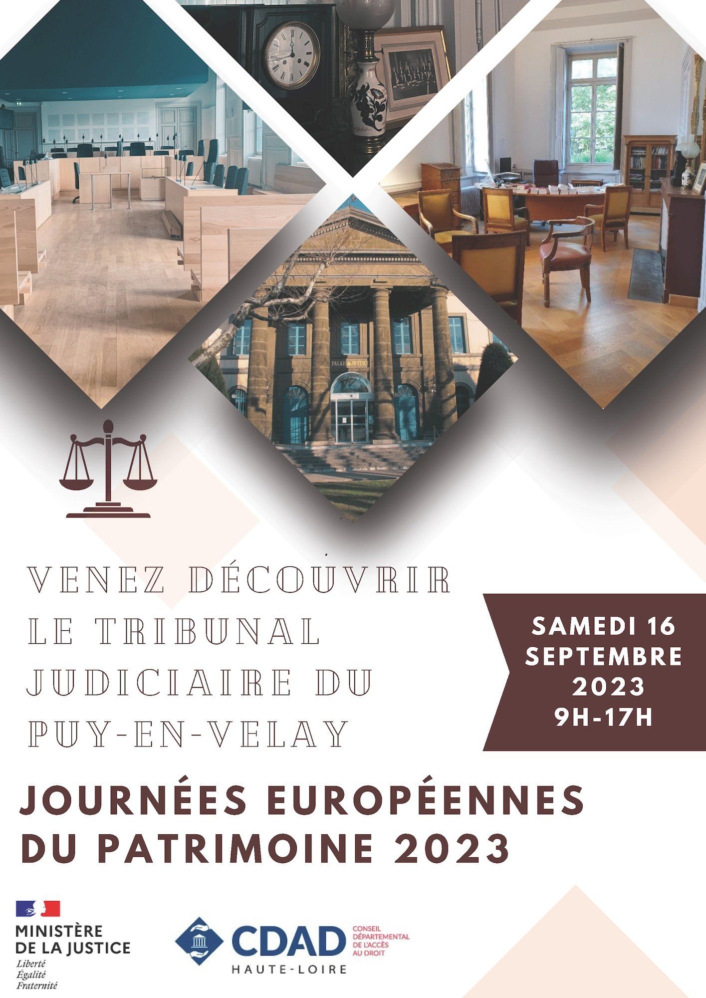 - À l’occasion des Journées européennes du patrimoine 2023, le tribunal judiciaire du Puy-en-Velay ouvrira ses portes pour la deuxième année consécutive, le samedi 16 septembre de 9 heures à 17 heures.