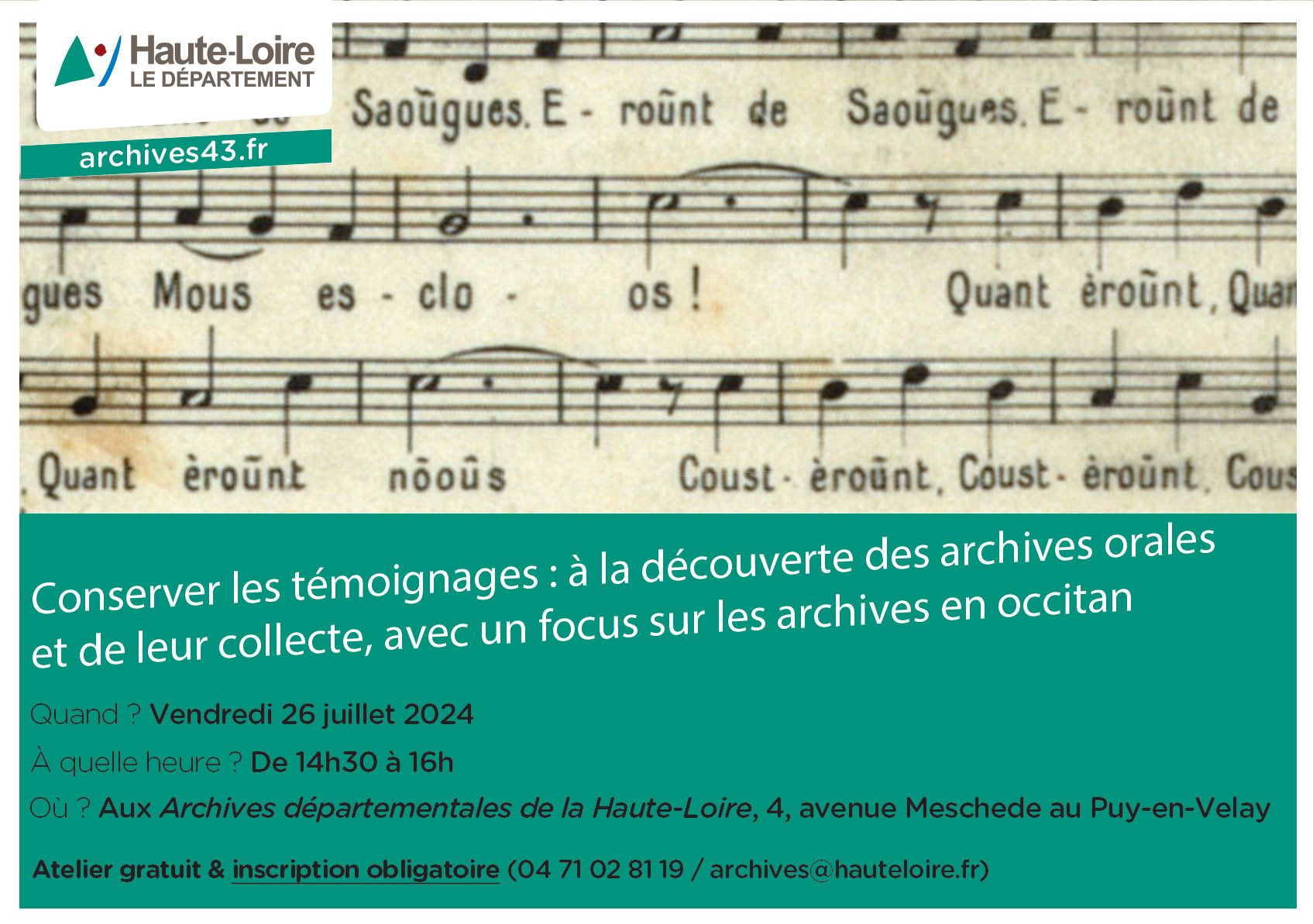 - Les Archives départementales de la Haute-Loire vous proposent un atelier-découverte inédit Conserver les témoignages : à la découverte des archives orales et de leur collecte, avec un focus sur les archives en occitan.