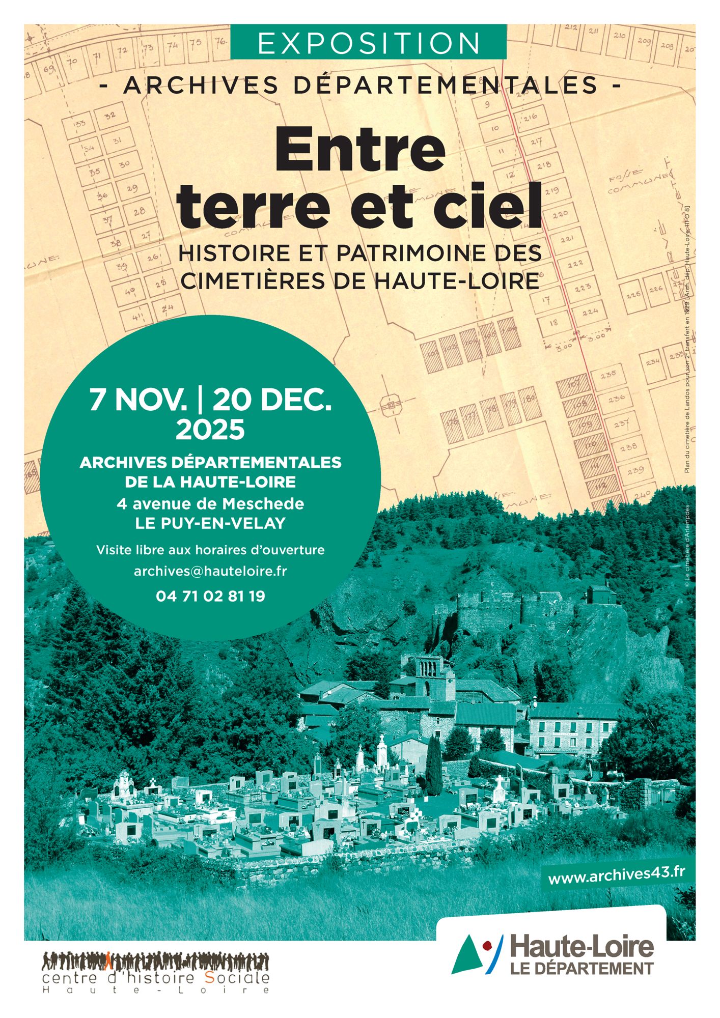 L’exposition Entre terre et ciel. Histoire et patrimoine des cimetières de Haute-Loire a été pensée et est organisée pour revenir sur l’histoire des cimetières depuis l’Ancien Régime jusqu’à la fin du XXe siècle, en s’appuyant sur les sources archivistiques et une riche illustration. Elle vise aussi à donner quelques clés de lecture sur le patrimoine qu’ils conservent et qu’ils constituent.