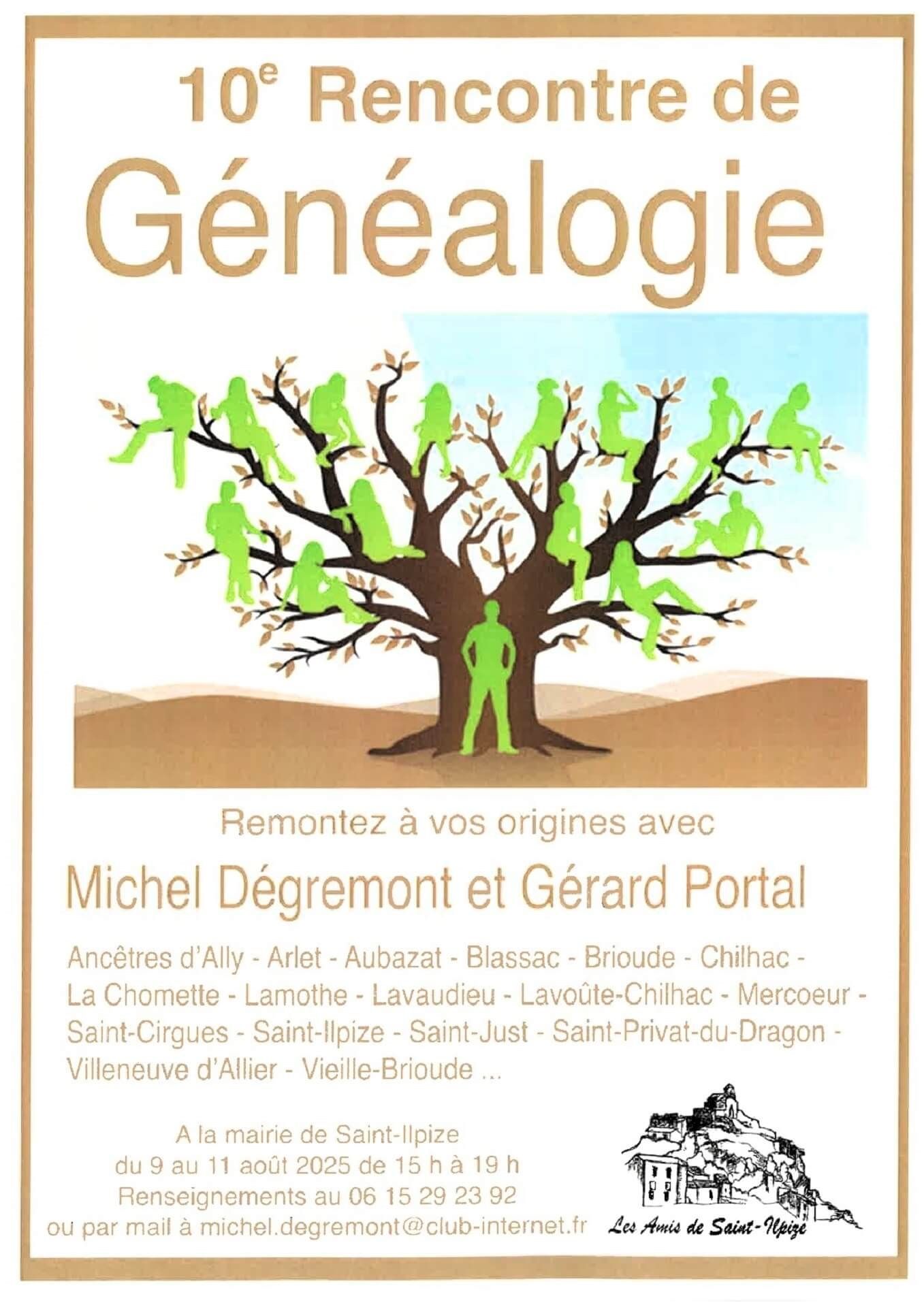 Afin de marquer le dixième anniversaire de la Rencontre, deux personnalités du monde de la généalogie ont été invitées à participer à cette rencontre. Le samedi 9, à 16h30, Alain ROSSI, vice-président du CGHAV (cercle généalogique et héraldique de l’Auvergne et du Velay) fera un exposé intitulé : "La lecture des bailliages et des rôles de taille de Saint-Ilpize". Et le lundi 11, à la même heure, Michel PERROT, de l’association généalogique 43 du Puy en Velay, viendra présenter le site gratuit Généal 43 qui facilite les recherches dans les archives départementales de Haute-Loire.