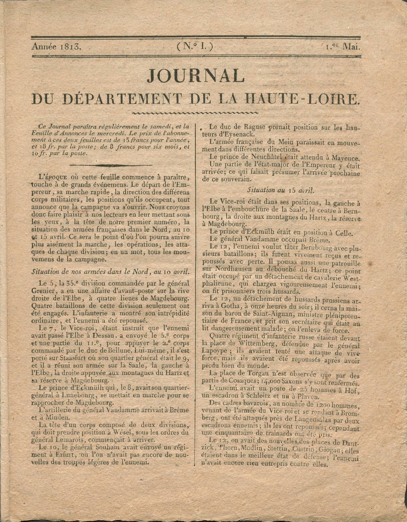 Le premier titre désormais accessible en intégralité est le Journal de la Haute-Loire, littéraire, commercial et judiciaire, couvrant la période 1813–1840, consultable à partir de ce lien.