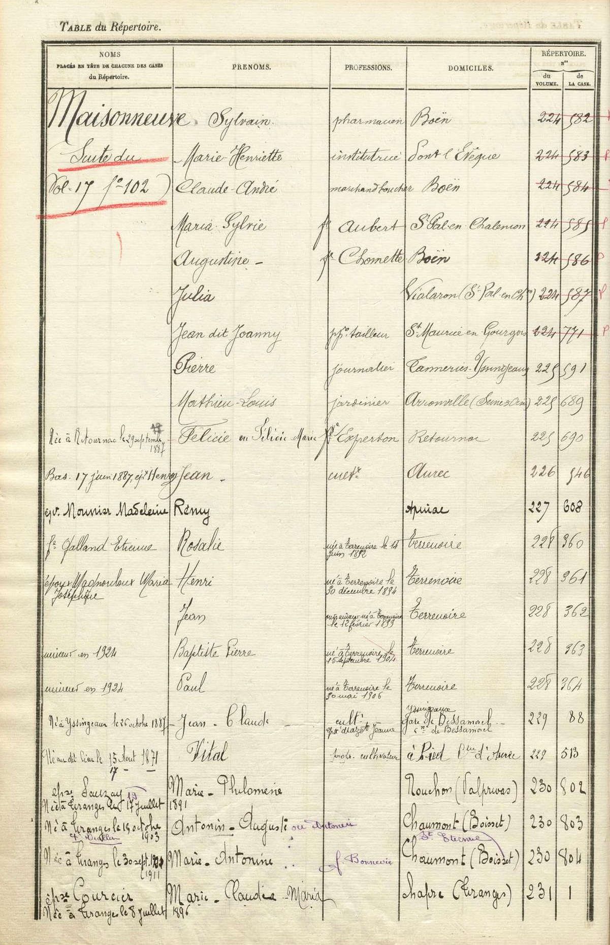 Le registre indicateur du bureau de la conservation du Puy-en-Velay (4 Q 2937) indique de se reporter au volume 1 et au numéro de folio 144 de la table alphabétique du répertoire des formalités.