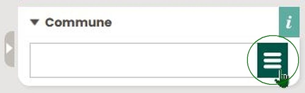 - Cliquez sur le bouton de liste (ou bouton "burger" représenté par 3 petits traits empilés (situé à droite du champ Commune) du premier filtre de recherche "Commune", situé à droite de l'écran.