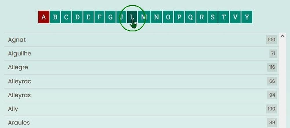 - La suite des initiales débutant chaque nom de communes (initiales) s'affiche, dans l'ordre alphabétique, cliquez sur la lettre qui vous intéresse (par exemple "L" si vous recherchez sur la commune Le Puy-en-Velay)