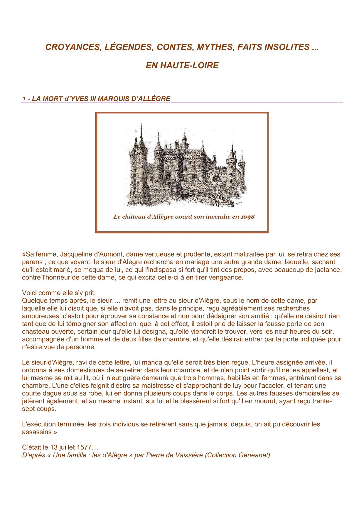 Sommaire du recueil de textes "Croyances, légendes, contes, mythes, faits insolites... en Haute-Loire (1)"