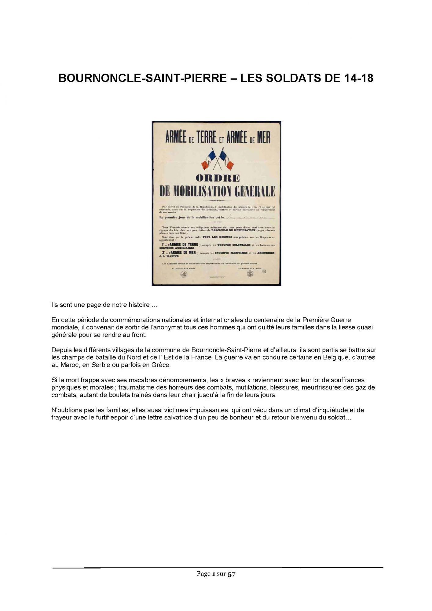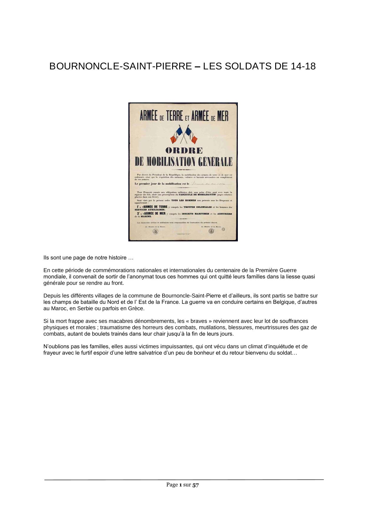 - Ils sont une page de notre histoire que Raymond Caremier nous fait (re)découvrir… En cette période de commémorations nationales et internationales du centenaire de la Première Guerre mondiale, il convenait de sortir de l’anonymat tous ces hommes qui ont quitté leurs familles dans la liesse quasi générale pour se rendre au front. Depuis les différents villages de la commune de Bournoncle-Saint-Pierre et d’ailleurs, ils sont partis se battre sur les champs de bataille du Nord et de l’Est de la France. La guerre va en conduire certains en Belgique, d’autres au Maroc, en Serbie ou parfois en Grèce. Si la mort frappe avec ses macabres dénombrements, les « braves » reviennent avec leur lot de souffrances physiques et morales ; traumatisme des horreurs des combats, mutilations, blessures, meurtrissures des gaz de combats, autant de boulets trainés dans leur chair jusqu’à la fin de leurs jours. N’oublions pas les familles, elles aussi victimes impuissantes, qui ont vécu dans un climat d’inquiétude et de frayeur avec le furtif espoir d’une lettre salvatrice d’un peu de bonheur et du retour bienvenu du soldat… Consultable également sur Geneanet, copyright : WC272H4 du 24 avril 2017.