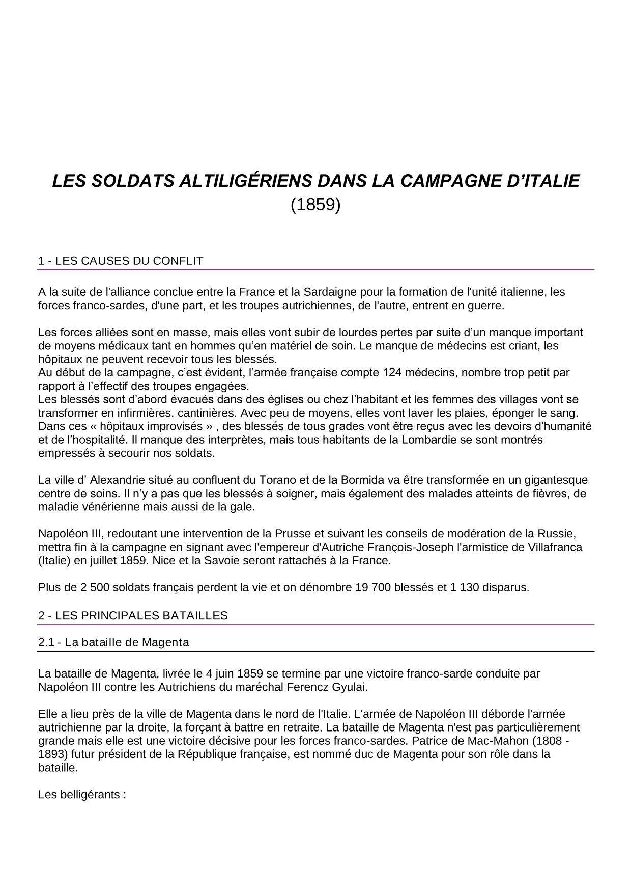 - À la suite de l'alliance conclue entre la France et la Sardaigne pour la formation de l'unité italienne, les forces franco-sardes, d'une part, et les troupes autrichiennes, de l'autre, entrent en guerre. Ce conflit va mettre en avant le manque cruel de médecins et de personnel médical qualifié pour soigner les blessés. Raymond Caremier nous invite à découvrir les conscrits altiligériens qui ont été mêlés à cette guerre en participant aux combats, hélas sanglants, aux noms évocateurs de Solferino, Magenta, Turbigo, etc. Consultable également sur Geneanet (copyright : 4U2U1D6 du 24 juin 2013).