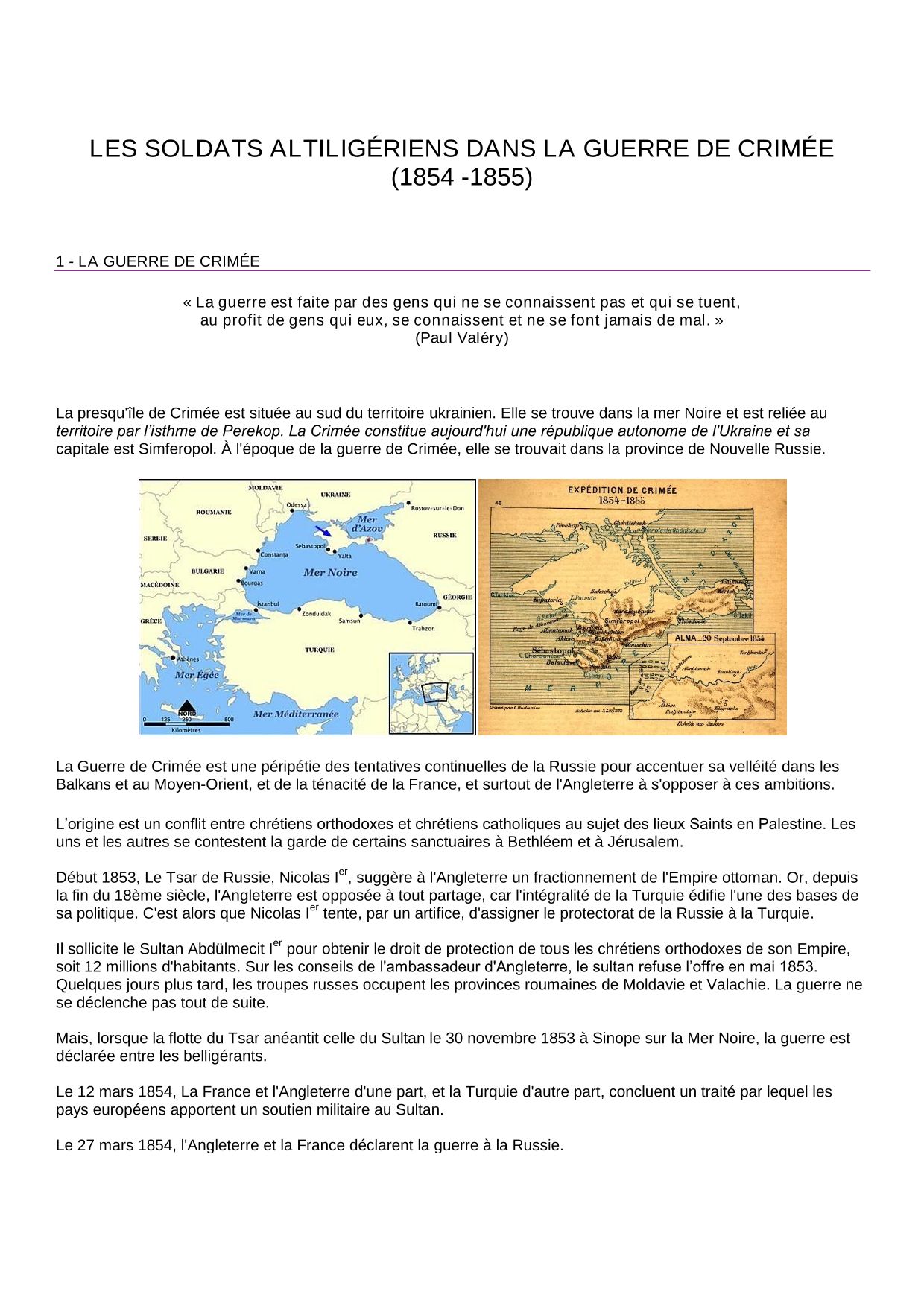 De 1853 à 1856, la coalition composée de l'Empire ottoman, de la France, du Royaume-Uni et du royaume de Sardaigne s'oppose à l'expansionnisme de l'Empire russe au cours de la guerre de Crimée. Les combats prennent part principalement en Crimée, aux abords de la base navale de Sébastopol. Suite à la conquête du bastion de Malakoff par les troupes françaises le 8 septembre 1855, les soldats Russes évacuent Sébastopol puis le traité de Paris de 1856 entérine la défaite russe. Raymond Caremier revient sur ces évènements et dresse une liste de soldats altiligériens morts lors de cette guerre. Pour chacun d'eux il nous donne des informations liées à l'état civil, l'unité militaire d'affectation et la cause du décès.