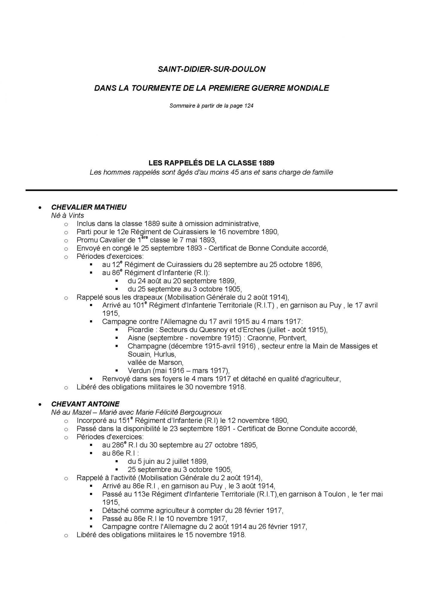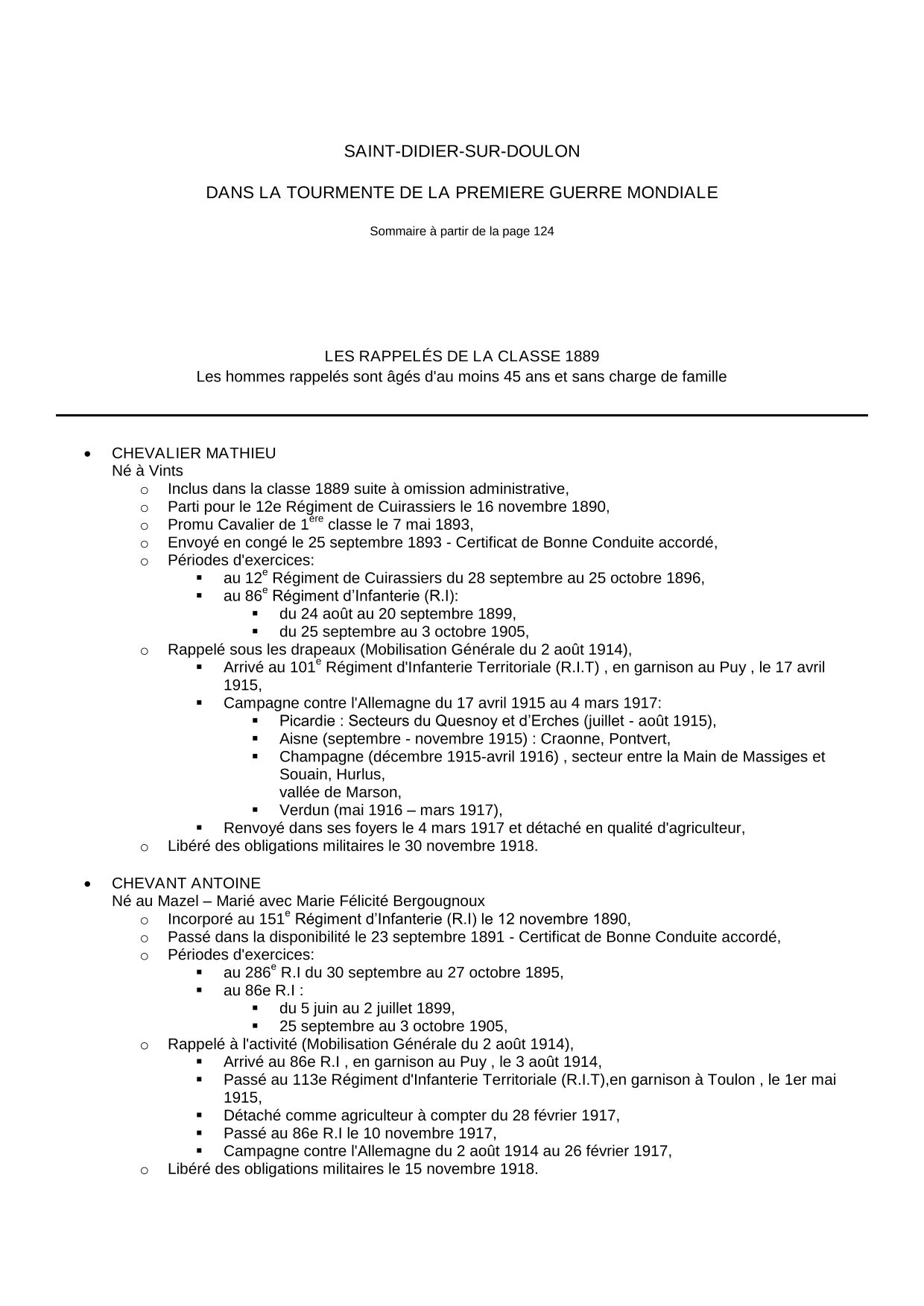 - Raymond Caremier nous présente les tranches de la vie des 240 saindiérois qui ont participé au conflit mondial et donné une part de leur existence à la collectivité nationale. À Saint-Didier-sur-Doulon, commune de la Haute-Loire, sans exception, toutes les familles sont touchées ; des frères, des gendres, des neveux, des cousins sont rappelés sous les drapeaux. Elles deviennent les victimes collatérales et impuissantes du chaos qui déchire le monde…. Consultable également sur Geneanet, copyright : 4U2U1G1 du 2 janvier 2016.