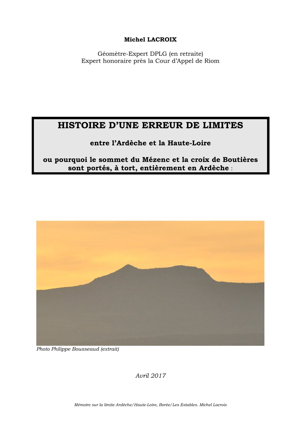 - L'étude "Histoire d'une erreur de limites entre l'Ardèche et la Haute-Loire ou pourquoi le sommet du Mézenc et la croix de Boutières sont portés, à tort, entièrement en Ardèche", présentée ici est un résumé d'une étude ayant fait l'objet d'une publication restreinte en juillet 2015, en cours de complément. Les lecteurs qui souhaitent approfondir l'affaire peuvent acquérir cette version complète en s'adressant à l'auteur.