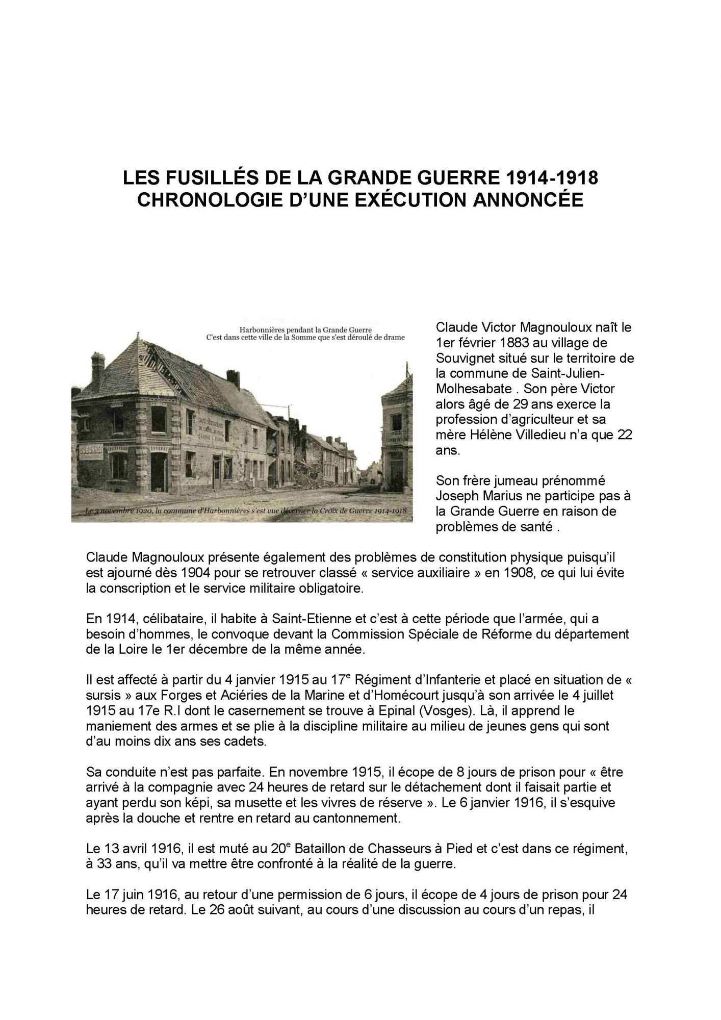 - En 1914, Claude Magnouloux natif de Saint-Julien-Molhesabate (Haute-Loire) habite Saint-Étienne où il exerce la profession d’ouvrier métallurgiste. Appartenant à la classe 1903, il n’a pas été rappelé sous les drapeaux en raison d’une inaptitude médicale au service armé. Dès le 20 septembre 1914, un décret cherche à trouver les hommes du « service auxiliaire » aptes au « service armé ». Ces hommes sont convoqués à plusieurs reprises devant des commissions de réforme pour déterminer leurs aptitudes au service armé. C’est ainsi que Magnouloux va devenir soldat sans avoir effectué de service militaire et envoyé au front. Il a alors 31 ans. Sur sa route, il croise Jean Michel Verdier, originaire de Compains (Puy-de-Dôme), soldat de la classe 1911 qui a été promu sous-lieutenant le 22 décembre 1915 et c’est à ce titre que Claude Magnouloux se trouve placé sous ses ordres. À l’issue d’une revue de la compagnie à laquelle Magnouloux se soustrait, le sous-lieutenant lui inflige quatre jours de prison. Pour des raisons ignorées, Magnouloux tire plusieurs coups de pistolet sur l’officier qui sera mortellement blessé. S’en suit immédiatement une procédure à la suite de laquelle Claude Magnouloux se retrouvera face au peloton d’exécution… Raymond Caremier nous propose de découvrir les différentes phases du procès. Consultable également sur Geneanet, copyright : 4U2U1G1 du 2 janvier 2016).
