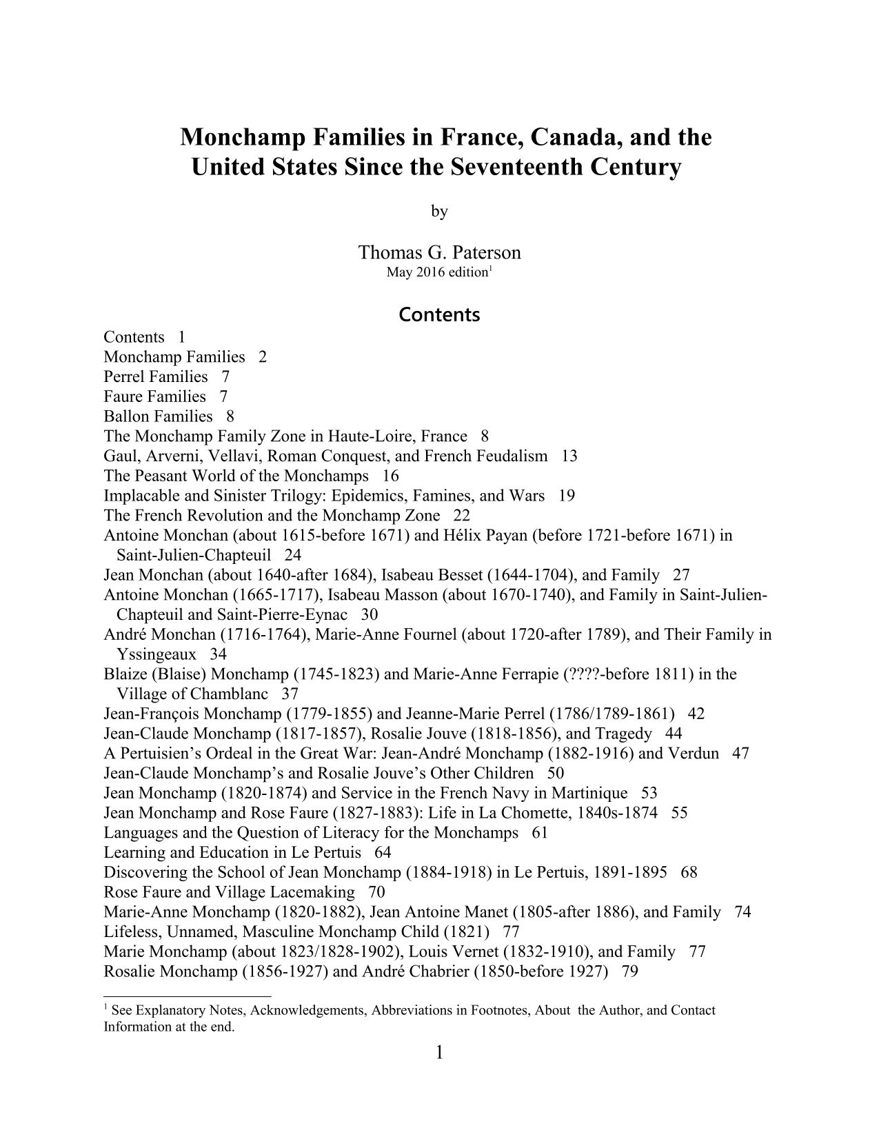 - L'objectif de Thomas G. Paterson n'est pas uniquement généalogique. Son travail met en résonnance les parcours de ses différents ancêtres avec les grandes tendances des époques qu'ils traversent. Par ce prisme est étudiée par exemple l'agriculture française à la fin XIXe siècle. Ses réflexions portent aussi sur les motivations ayant poussé ces populations rurales à émigrer, du Pertuis (Haute-Loire) pour Notre-Dame-de-Lourdes (Manitoba) et Manitoba (Canada), et plus tard de quitter le Canada pour les États-Unis (Oregon). C'est le cas de son grand-père Antoine Monchamp (1858-1939), né à La Chomette, qui a quitté la Haute-Loire avec sa famille en avril 1895 pour s'installer à Notre-Dame-de-Lourdes au Manitoba et devenir un important producteur de blé. La chronique historique de la famille Monchamp commence toutefois bien avant le XIXe siècle.