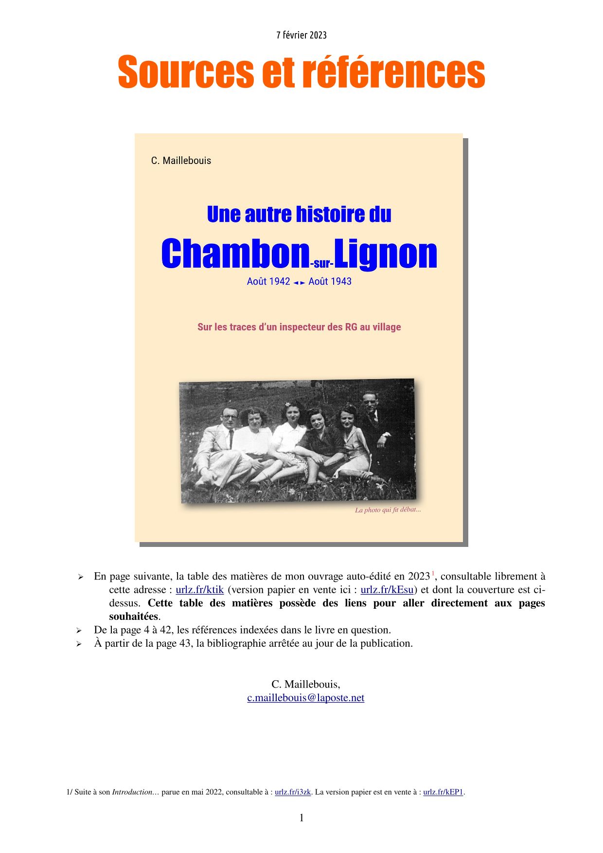 - Vous pouvez librement télécharger le fichier ci-dessous, qui contient l'ensemble des références (sources par chapitres ; la bibliographie générale ou par nature ; les index des illustrations et des noms cités.) de l'ouvrage de Christian Maillebouis : Une autre histoire du Chambon-sur-Lignon 1942-1943, Mazet-Saint-Voy, 2023, 550 pages.