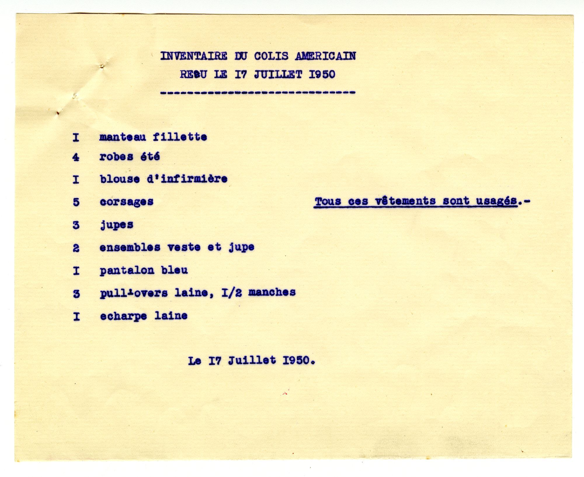 Inventaire du colis d’une donatrice américaine, 17 juillet 1950