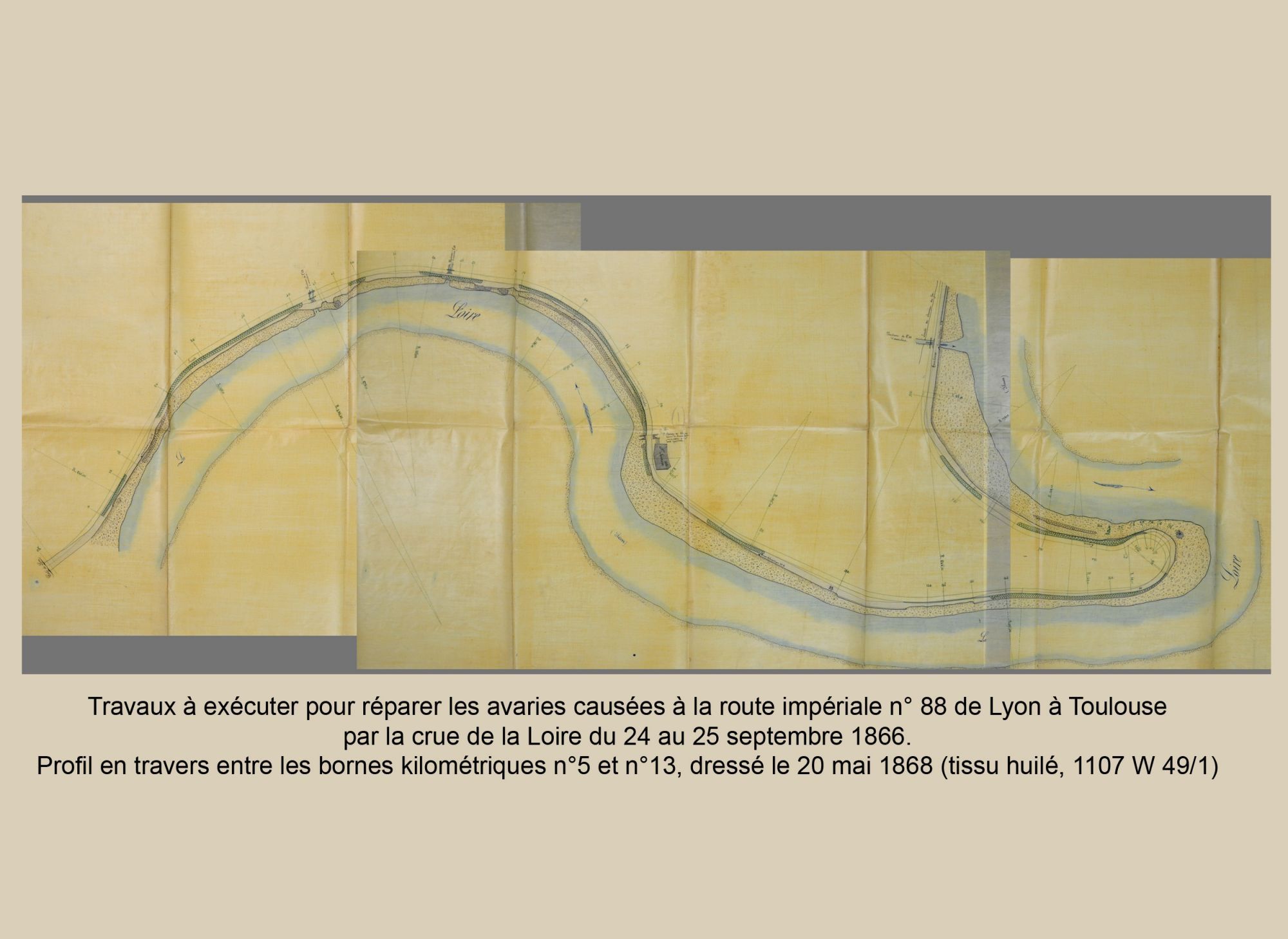 - Dans le fonds de la Direction départementale de l'équipement (1107 W 49), nous avons principalement retenu des plans prévoyant les travaux de réaménagement de la route impériale n° 88 de Lyon à Toulouse (actuelle route nationale 88) longeant la Loire et l'Allier. Ceux-ci témoignent du niveau des hautes eaux par rapport à l'étiage. Là encore les dossiers comptent de nombreux autres documents non numérisés en particulier des plans.