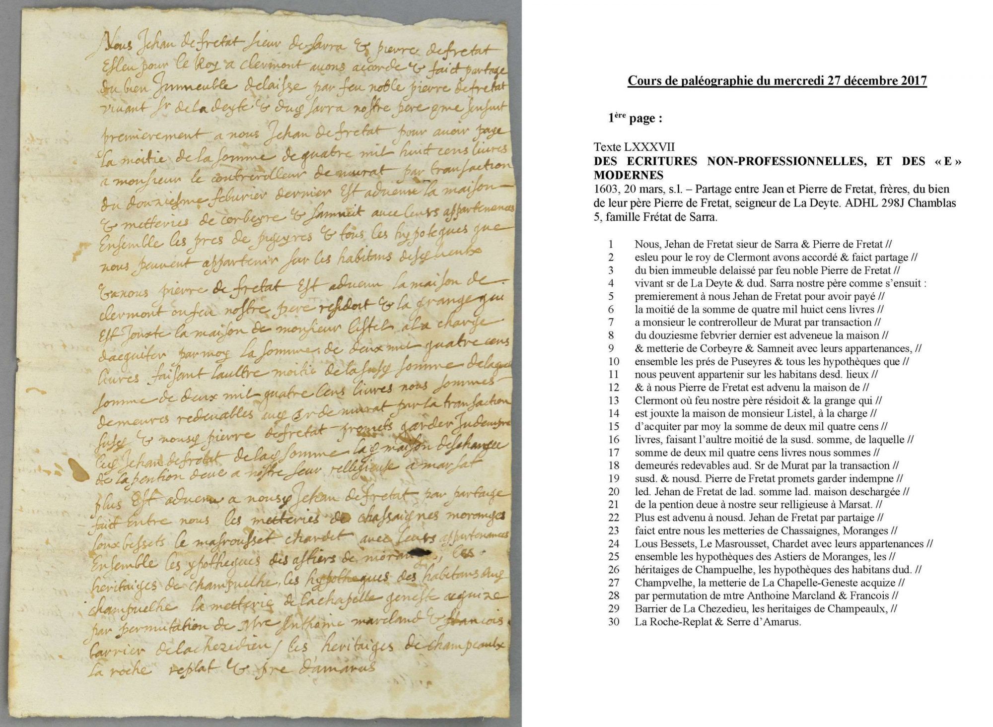 - Lors du cours de paléographie du mercredi 27 décembre 2017, un nouveau texte à déchiffrer vous est proposé.