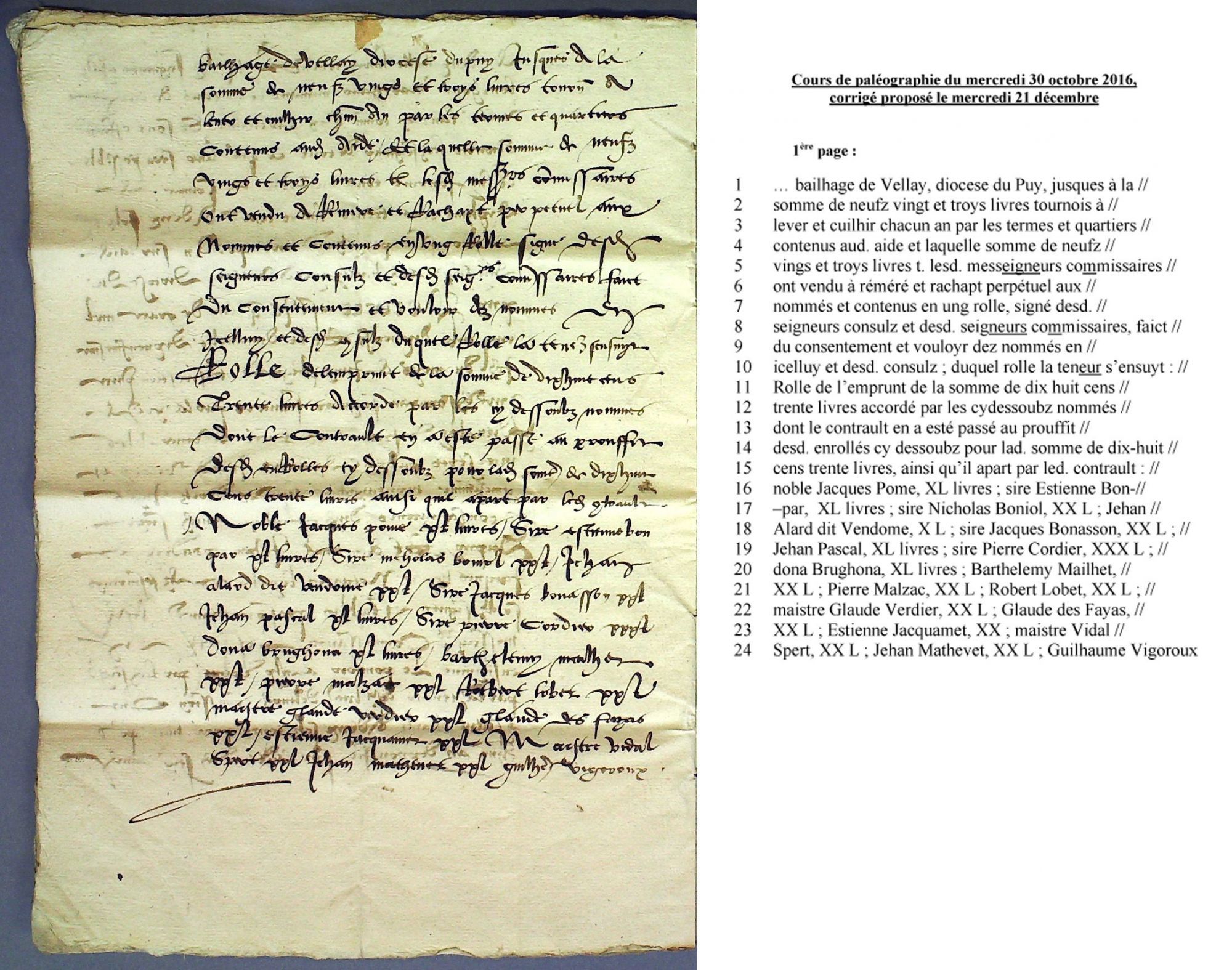 Cours de paléographie du mois de novembre 2016 et corrigé