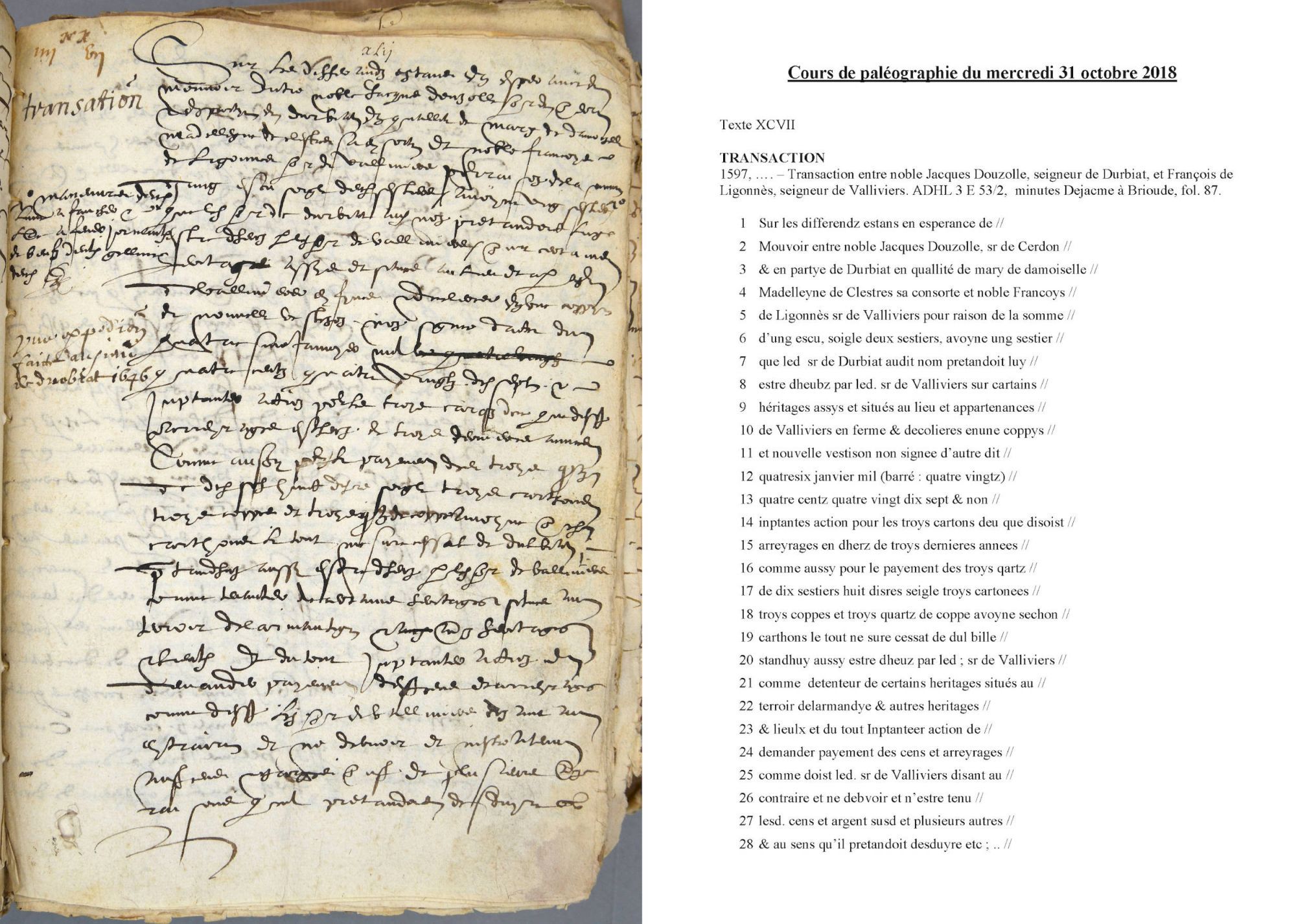 - Lors du cours de paléographie du mercredi 31 octobre 2018, un nouveau texte à déchiffrer vous est proposé.