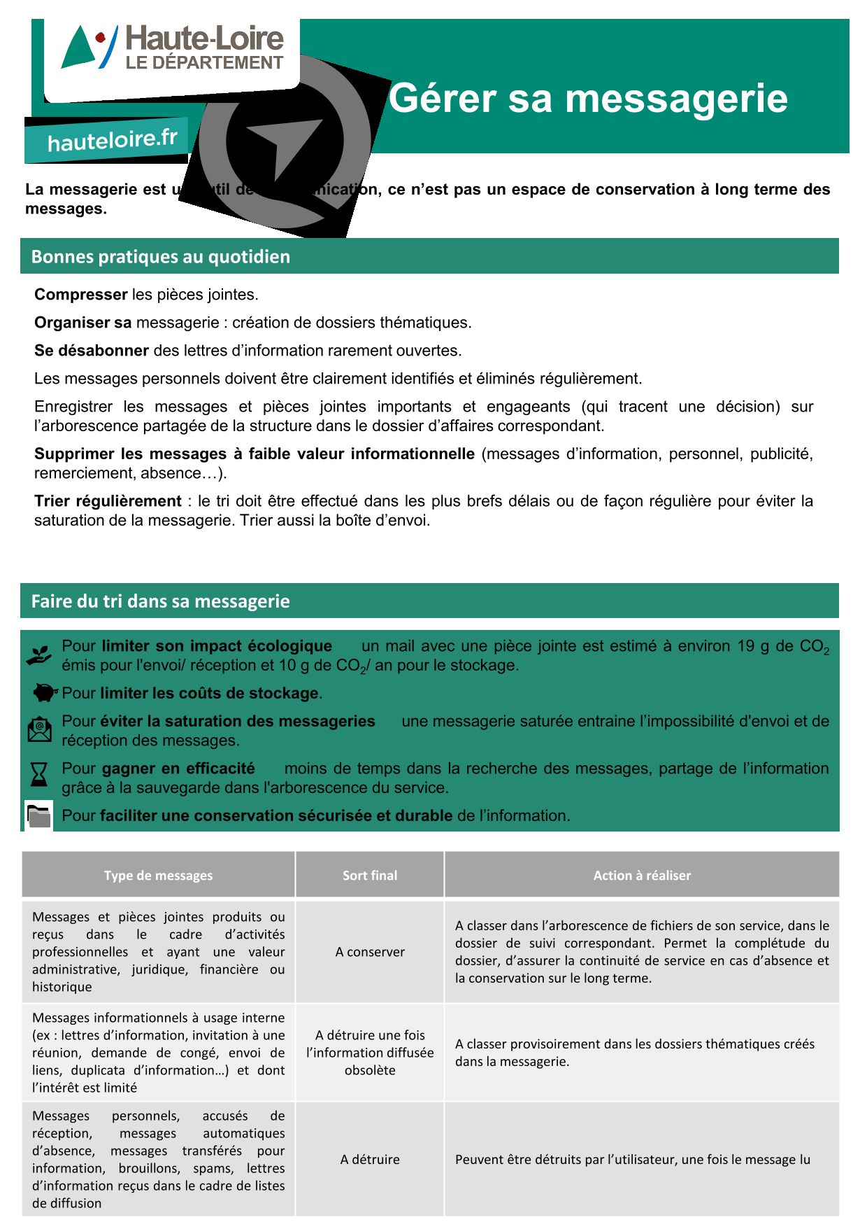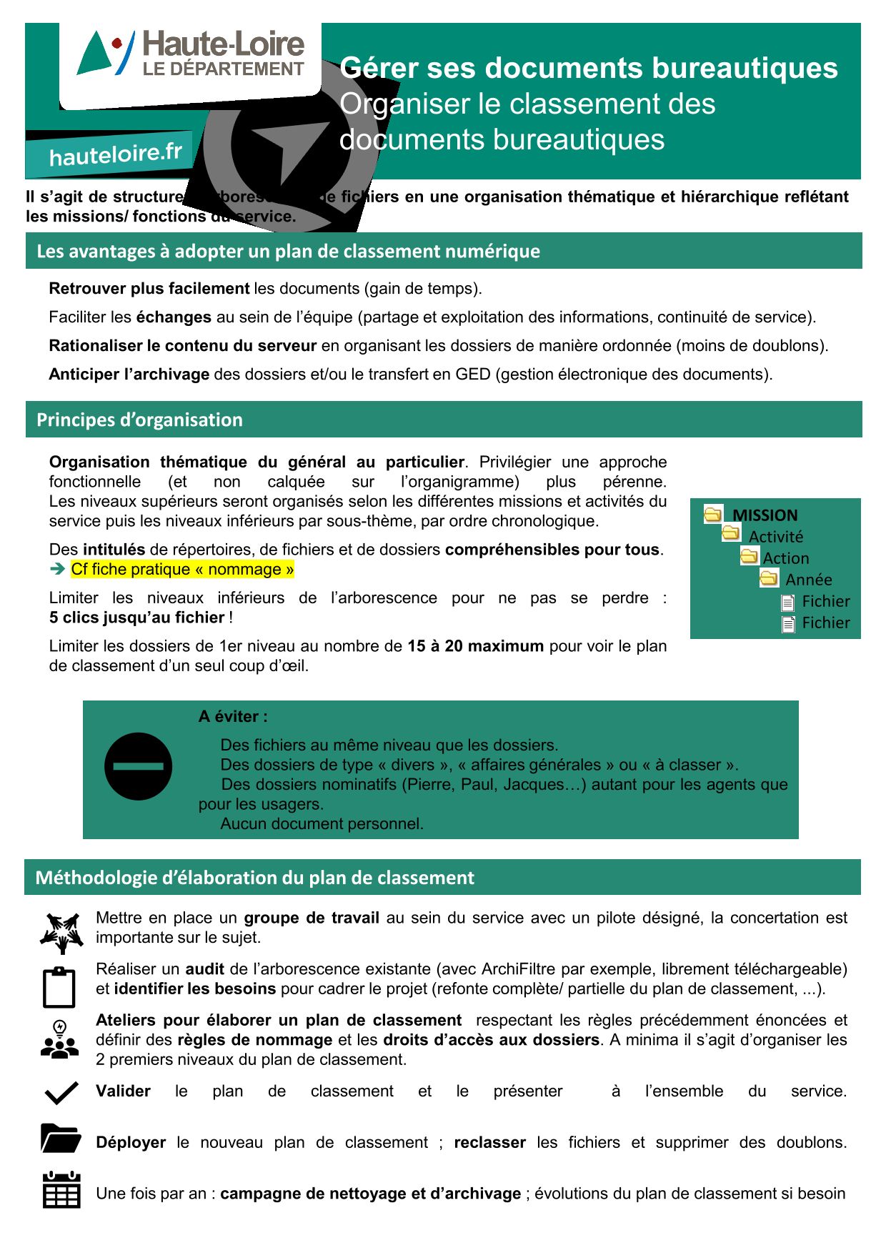 - Les Archives départementales vous proposent le résultat du travail réalisé en partenariat avec le Centre de Gestion et des communes volontaires du département de la Haute-Loire pour faciliter le classement des documents électroniques produits et reçus par les mairies dans l'exercice de leurs missions.